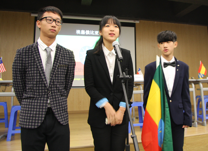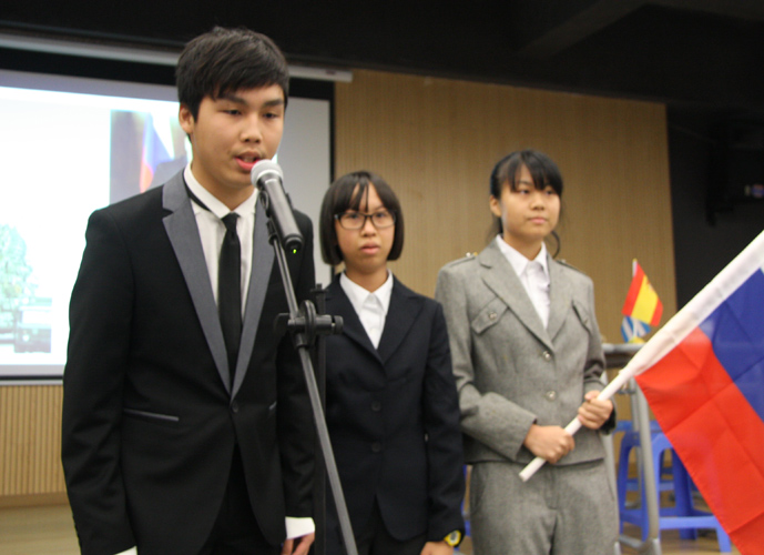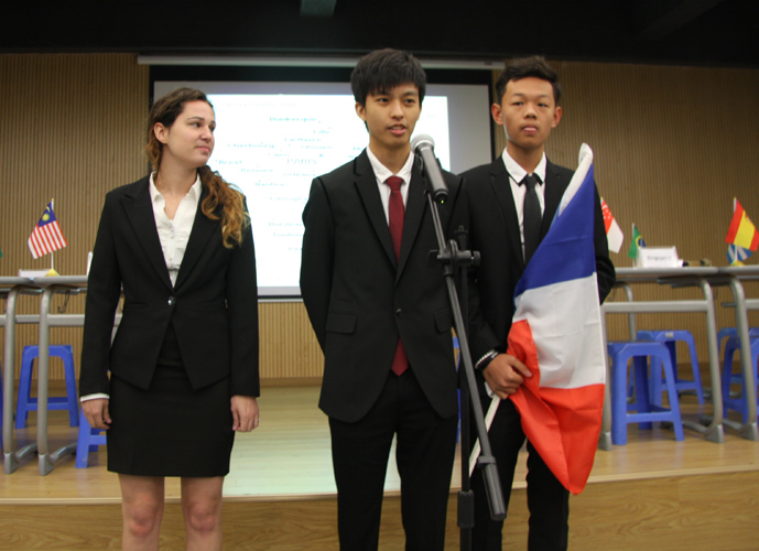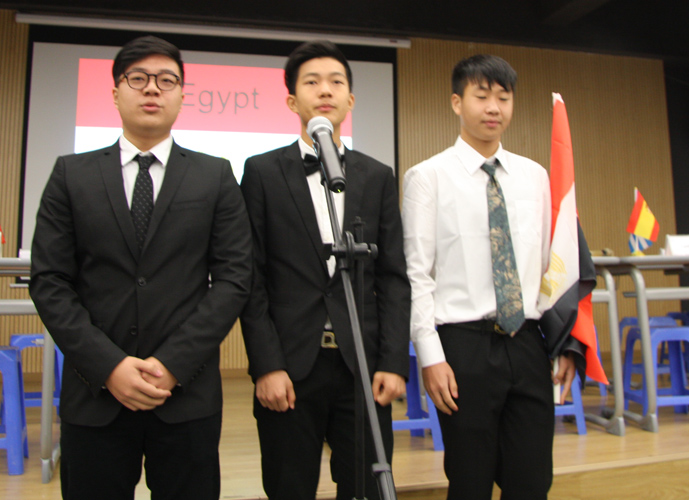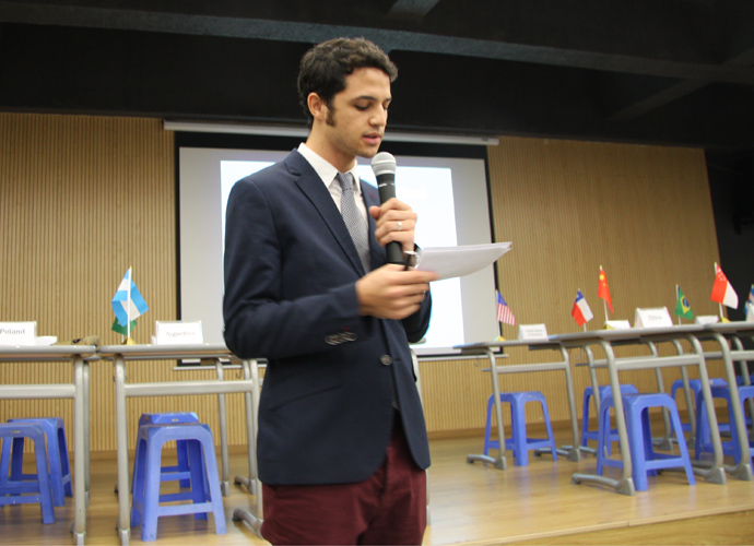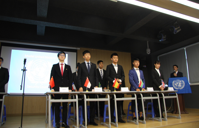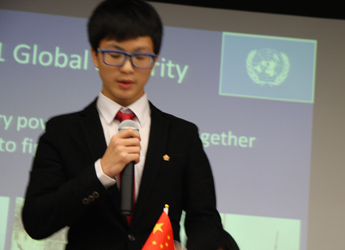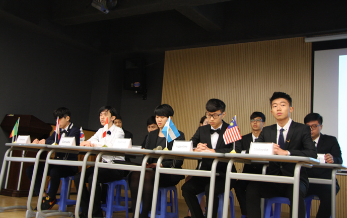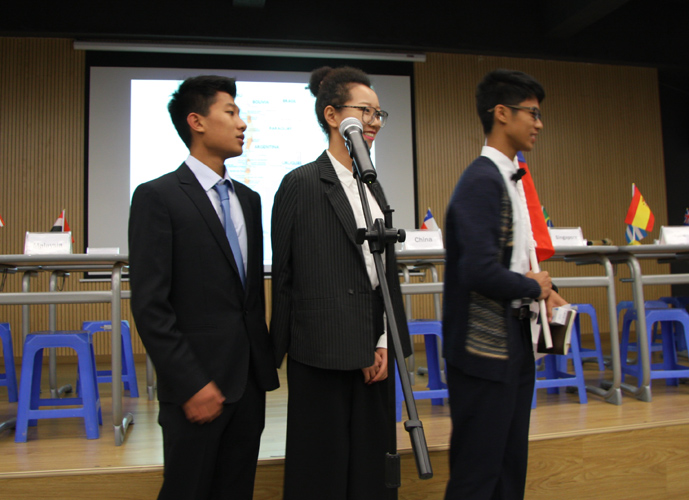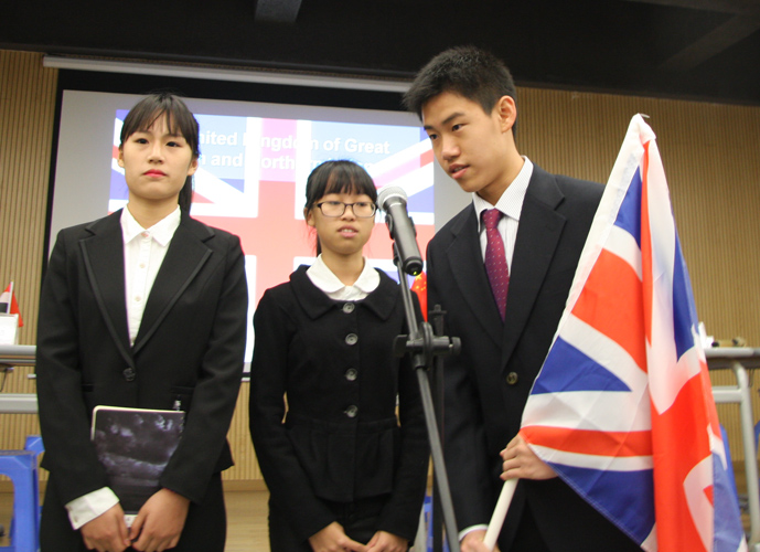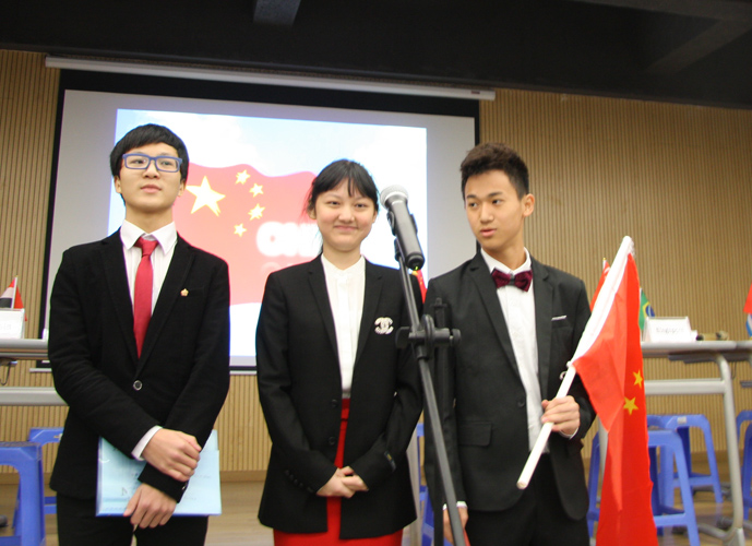 9:30,我们的重头戏——第四届模拟联合国,在学术报告厅隆重上演。外教MR.Ben担任主持人。在外教老师的引领下,各国代表队有序进入会场:英国、阿根廷、美国、加拿大、法国、新加坡、澳大利亚、巴西、俄罗斯、南非、马来西亚、波兰、韩国、泰国、埃及、尼日利亚……最后,中国代表队进场,全场起立,唱响了我们的国歌《义勇军进行曲》。在热烈的掌声中,第一轮代表队在舞台入座,模拟联合国正式开始。