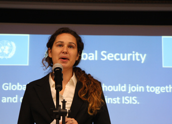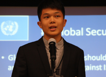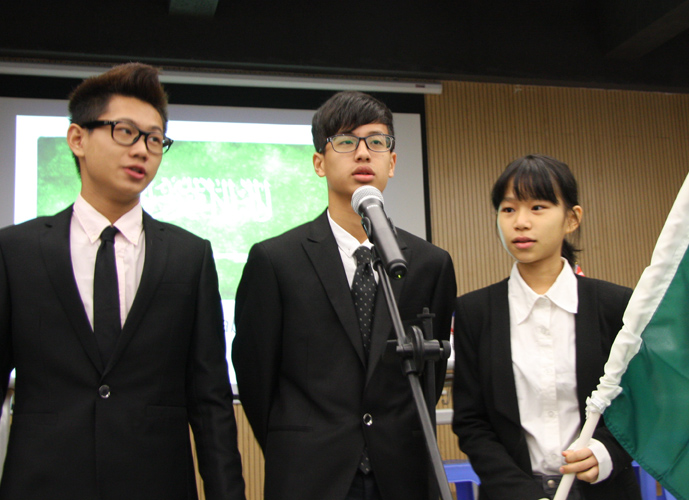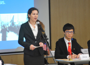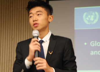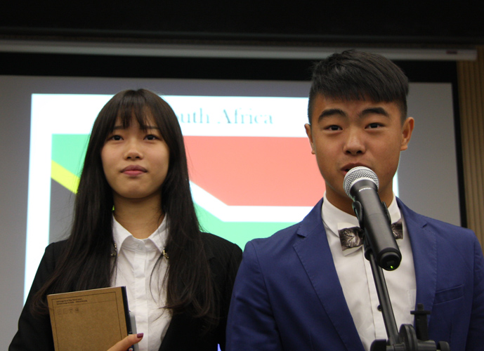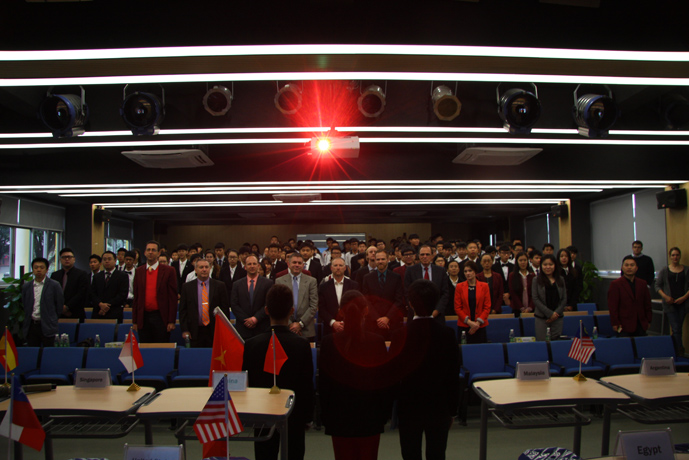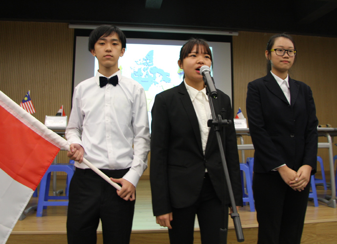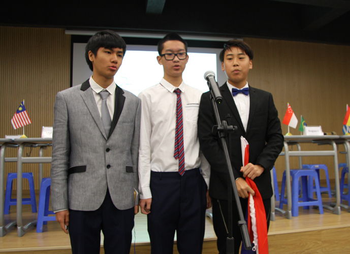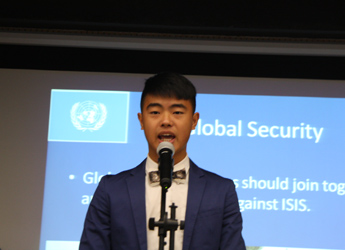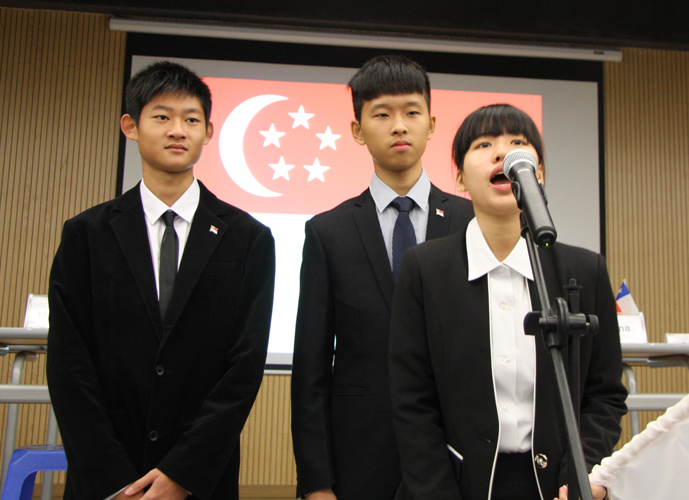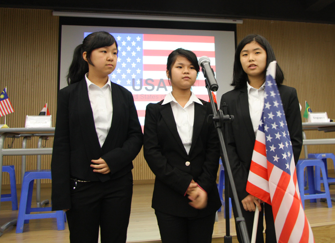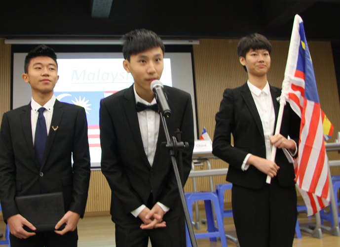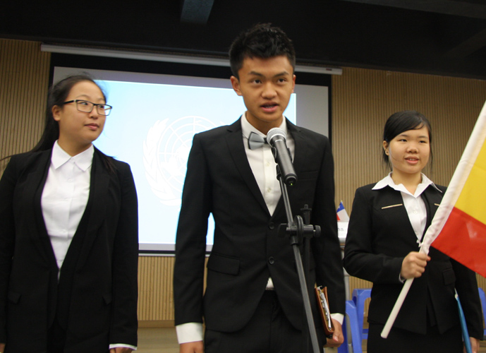 9:30,我们的重头戏——第四届模拟联合国,在学术报告厅隆重上演。外教MR.Ben担任主持人。在外教老师的引领下,各国代表队有序进入会场:英国、阿根廷、美国、加拿大、法国、新加坡、澳大利亚、巴西、俄罗斯、南非、马来西亚、波兰、韩国、泰国、埃及、尼日利亚……最后,中国代表队进场,全场起立,唱响了我们的国歌《义勇军进行曲》。在热烈的掌声中,第一轮代表队在舞台入座,模拟联合国正式开始。