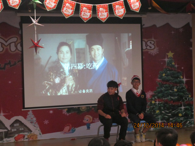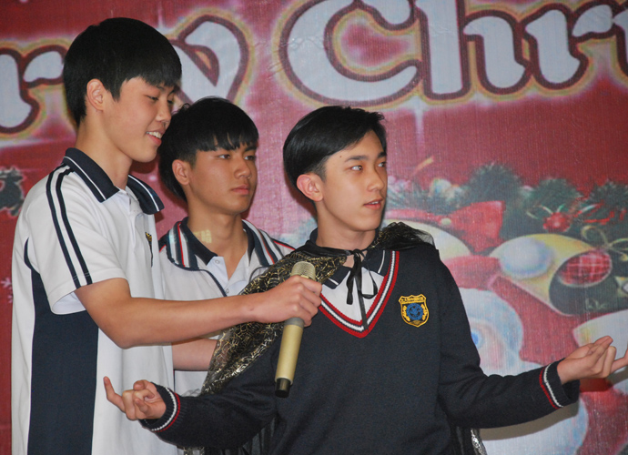 第一个节目,是《千手观音圣诞特别版》,如果你想看到穿着金黄华装,舒展着纤纤细指的美女,那你就错了,你看到的是国际十一年级憨厚的帅小伙,他们伸展着肌肉手臂,掐着兰花指,让人看到了刚和柔的完美结合。节目开头的背景音乐柔和,“观音们”表情专注, 动作流畅。当大家还沉醉在安静气氛当中的时候,音乐突然变得欢快,演员们开始载歌载舞,他们的滑稽动作让大家捧腹大笑。