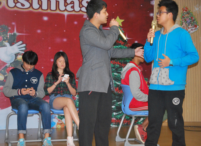 Dawn老师:嗯……其实我觉得这次的圣诞节目没有排名是一件好事,因为不用这么严肃,让评委去打分,然后评出第一名是没有意义的。没有评分的话每个人都可以毫无压力地全身心投入地去表演。这次学生会政府举行圣诞节目主要目的就是为大家营造圣诞节的那种欢庆、快乐、热闹的气氛。