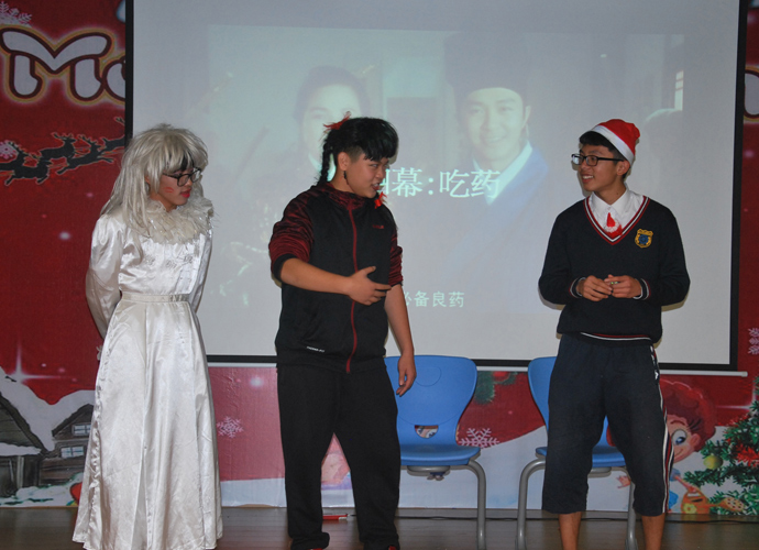国际部九年(2)班表演的《朱丽叶与野兽》,讲述的是一个自称天才的导演让演员试戏的故事。本剧采用了剧中剧的结构,把《罗密欧与朱丽叶》和《美女与野兽》完美结合在一起。导演是剧情发展的关键,她主导了所有角色的行为。小品剧情大起大落,牵动着观众的心弦,又以钢琴伴奏,舒缓观众紧绷的神经,演员表演夸张,惹得观众狂笑不已。其中,罗密欧吃了勇气(一根不剥皮的香蕉)之后变高富帅(另一同学扮演)的情节,让人不得不佩服同学们的创意。