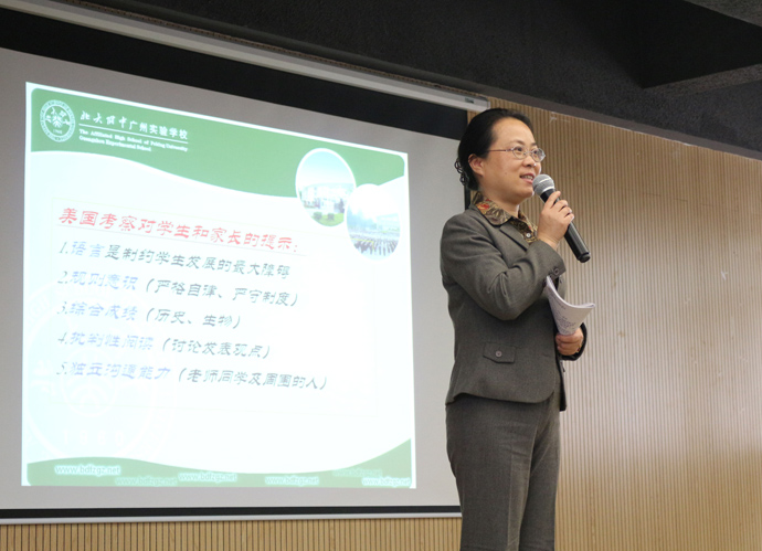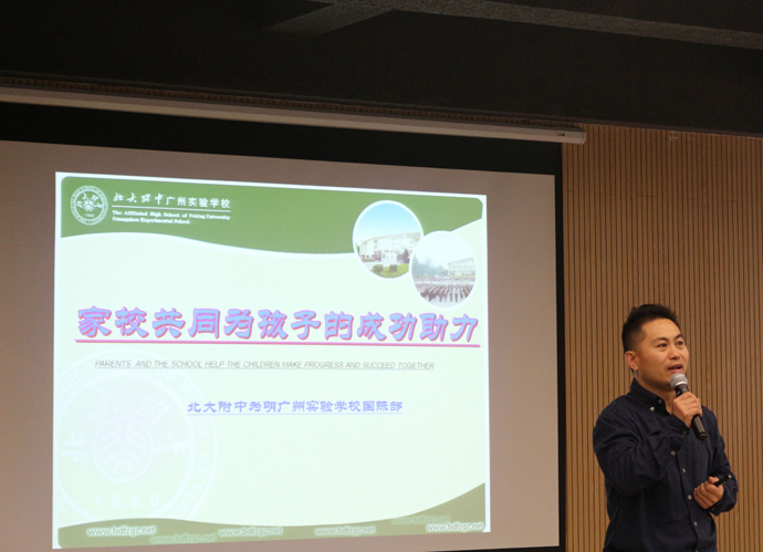 首先是孙明亮主任发言,他展示了这次去美国考察的图片,在美国留学的学生的生活近照,告诉学生,这将是他们的未来。美国考察对学生和家长的提示: 1.语言是制约学生发展的最大障碍 2.规则意识(严格自律、严守制度) 3.综合成绩(历史、生物) 4.批判性阅读(讨论发表观点) 5.独立沟通能力(老师同学及周围的人)。接着他为家长介绍了国际部中国传统文化课程,美国原版课程, 综合类课。高效的课程质量提高孩子学术水平,丰富的课外活动提高孩子综合素质。