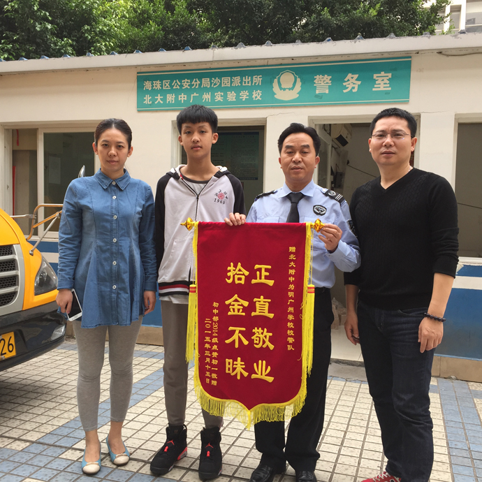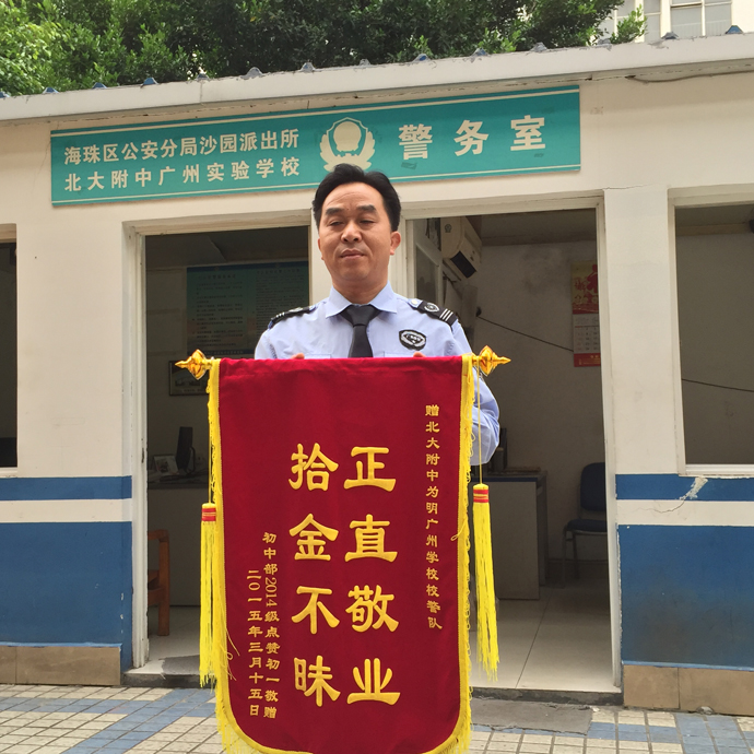 2015年3月17日,北大附中为明广州实验学校校警队的罗意平同志拾到一块价值近2000元的手表,多方努力寻找失主,无偿归还失主初一一班赵骏同学。他的这种拾金不昧的精神,在北大附中引起强烈反响,如春风化雨般滋润着领导老师同学们的心灵。大家无不对罗意平同志竖起大拇指。为他的这种精神点赞。