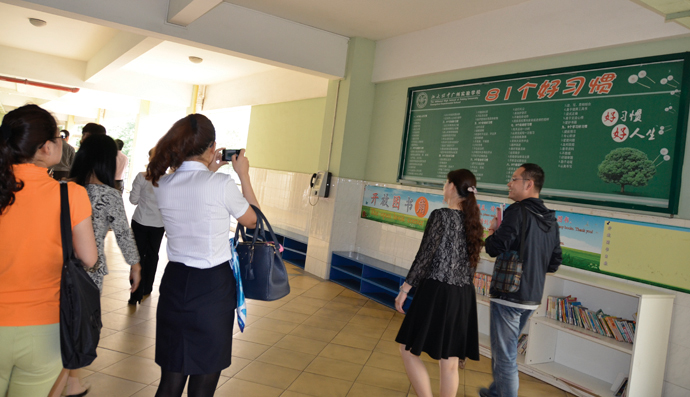 欢迎仪式后,两校同仁参观了我校各学部。小学部电子阅览室中呈现的学生亲手打造的“小蛮腰”、“机器人”等作品让老师们爱不释手;一路上孩子们的纯真与礼貌彰显出81个好习惯的培养效果;随处可见的学生作品展示、班级文化建设也散发出浓厚的学习氛围;优质课堂的舒适、明净更体现出高品质办学的力量••••••处处都让人赞叹!