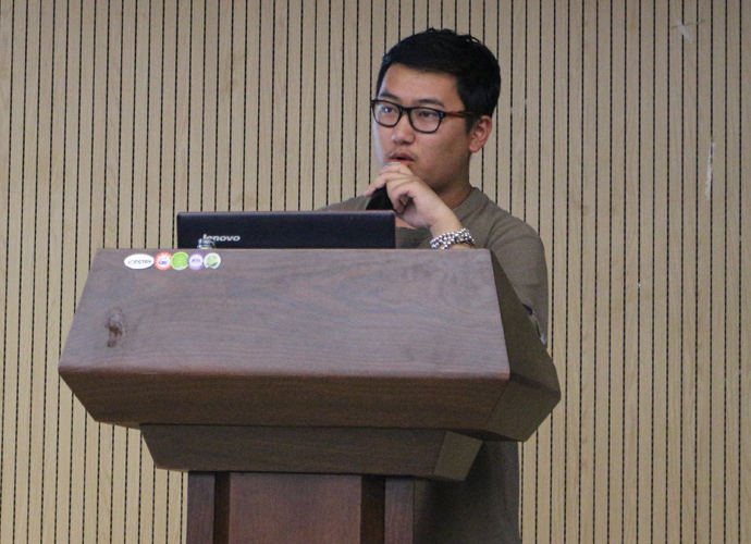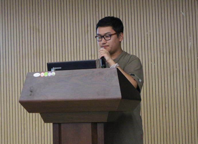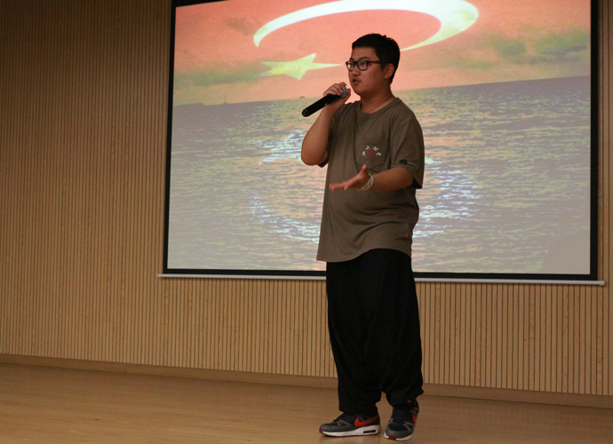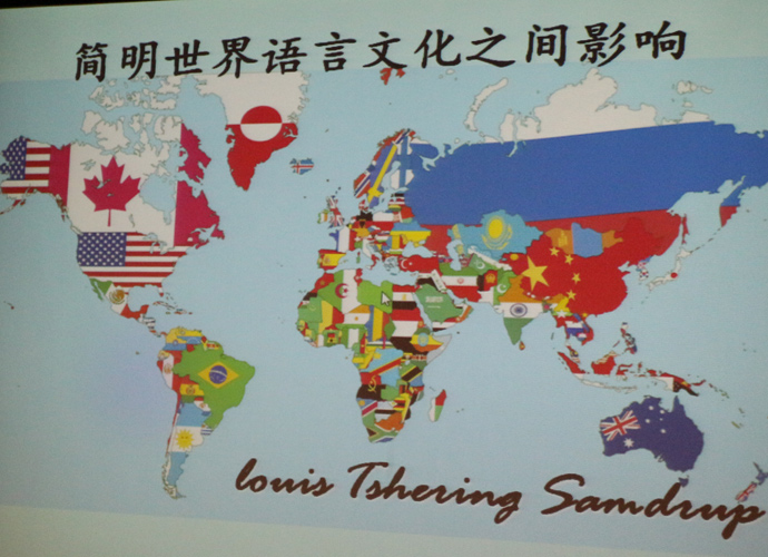 首先他介绍自己的名字,用广东话来念他的名字“泽郎三穆洲”,他爱这个名字,因为在藏语中,“泽郎”是“长生,永生”的意思,“三穆洲”是“所有的梦想都能实现”。但是同时也给他带来了一些小误会,他说道:“每当我向我的朋友介绍我的中文名的时候,他们都会认为我是一个日本人!”为了解释这个名字他可是大费口舌啊!他会很自豪地说他是一个西藏人。为了让同学们更了解西藏,他从西藏文字的结构开始讲解,然后讲西藏文字和其他文字的关系,文字中寓含的特别含义。他讲到激动处,神采飞扬,民族自豪感溢于言表。