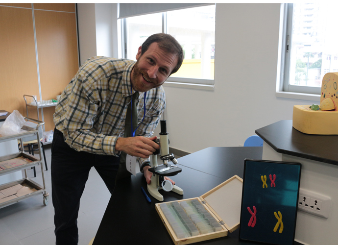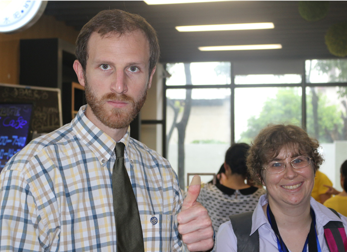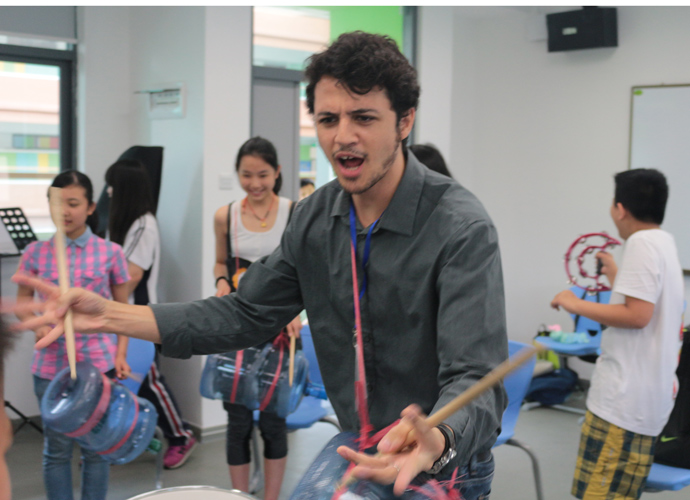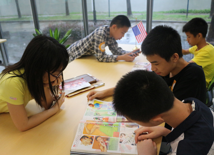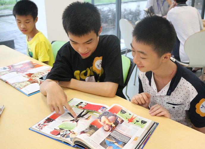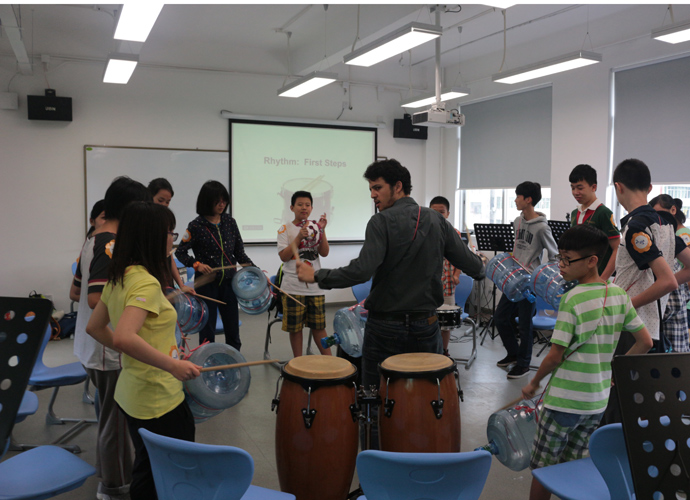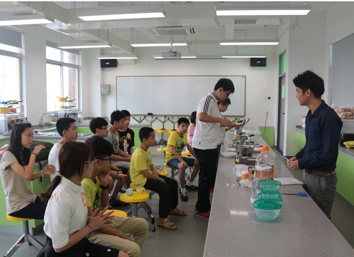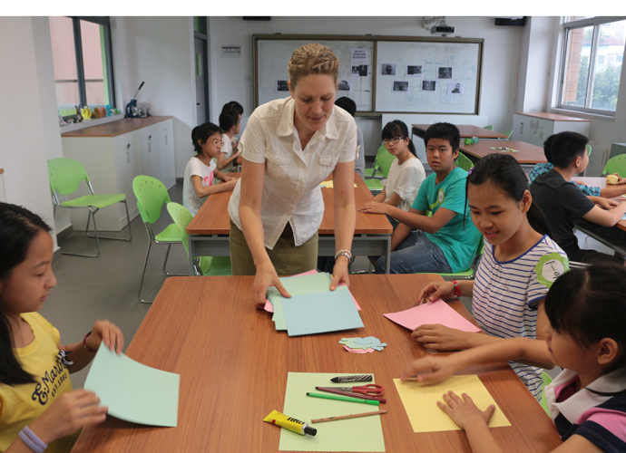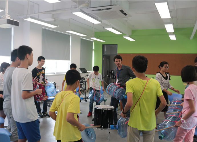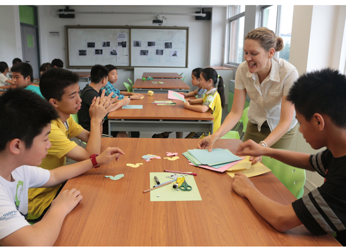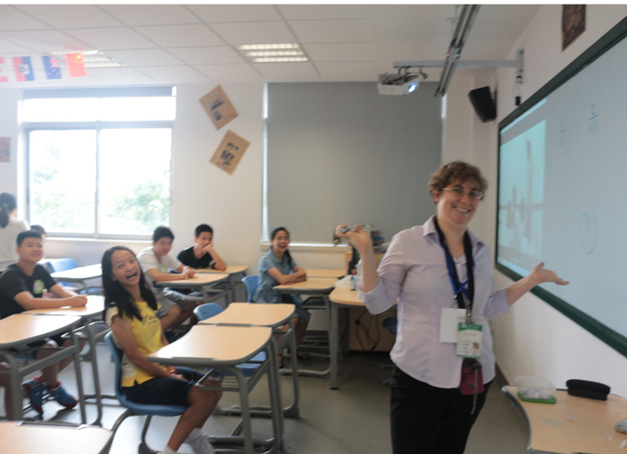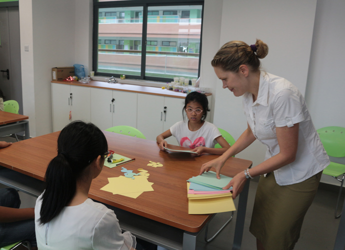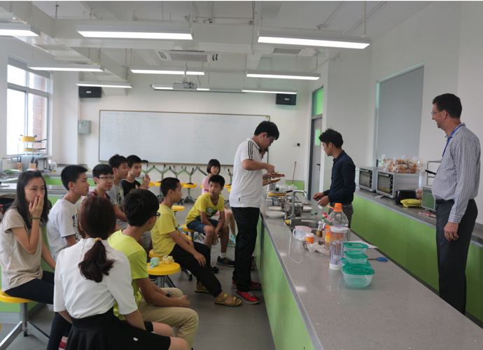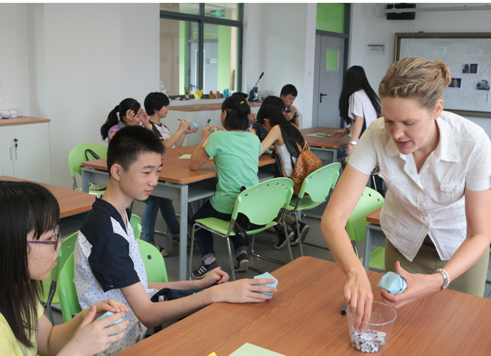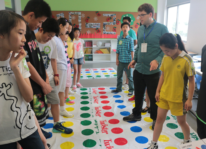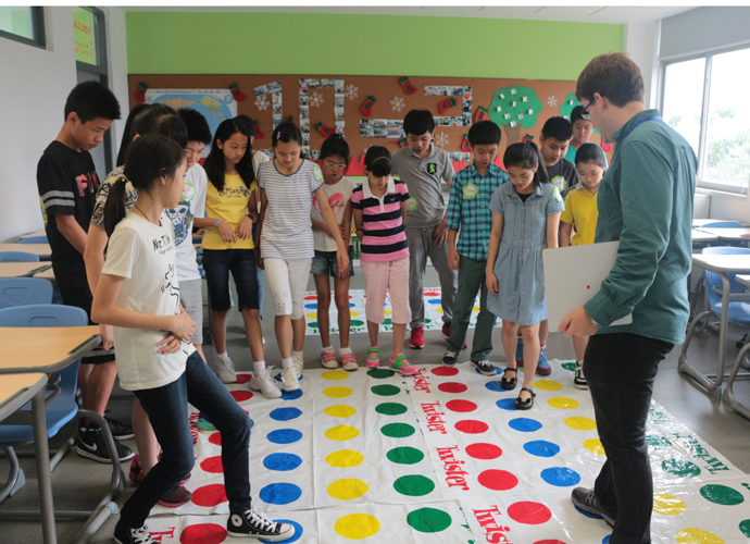 第一站:Jacob的科学实验室,Jacob教同学们使用显微镜观察细胞。他们三五个人围坐一张实验台,虽然在语言上跟不上,但通过外教的身体语言及动作,大概能理解,在短短几分钟讲解及观看示范后,同学们跃跃欲试,小心翼翼地从盒子里取出玻璃片,放在显微镜下观看,有些同学在调放大缩小的遇到了困难,英语好的同学重复了刚才老师的讲解,帮助不会操作的同学,体现了很好的团队协作精神。第二站:Jonathan的生物实验室,Jonathan教同学们使用臂式电子血压计来测量运动前后的血压变化。第三站:Jessica的语言教室,Jessica以分组做游戏的方式,让同学们在竞赛中学到新单词,当然了,最让同学们高兴的是获胜组可以得到棒棒糖。第四站,Nathan的教室。哇,同学们一进来就惊呆了,因为教室中央摆着一张像巨大棋盘的塑料胶,Nathan老师要干什么呢?哦,同学们很快就得出答案了,原来他是通过这个游戏来考验大家的语言感受和肢体协调能力。一个同学手里拿着一个小型指南针,拨动指针,例如,左手按红色点,右脚踩绿色点,然后发出指示,其他的同学照做。这个游戏,看起来简单,但做起来很难,反应慢的同学很快就被淘汰出局。第五站:Dawn的艺术教室。Dawn给每个同学发了一张彩纸,现场教同学们叠青蛙。第六站:Ben的音乐教室。Ben让同学们围成一圈,每人一个鼓,他在中间,在他的指挥下,同学们有时合奏,有时独奏,就像一个小乐队,同学们很投入。最后一站:Darren的烹饪教室。Darren教大家做一份特别的美式早餐,把土司放到烤面包机烘烤,然后涂上芝士。孩子们体验完七个站差不多90分钟的课程之后,觉得意犹未尽。中外方老师在孩子们体验课程的过程中,作了详细的记录及初步评价。