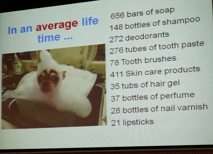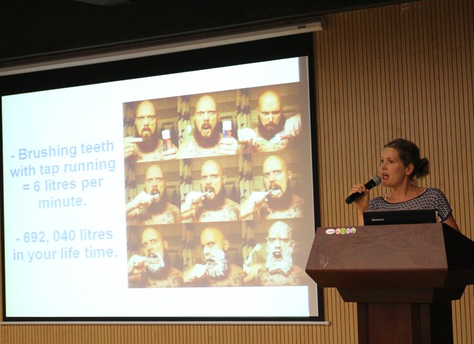 Dawn老师访问了学生们一个问题“How much water do we use in our lifetime?(在我们的一生中我们总共用了多少水?)”同学们不假思索的说出自己的答案,但是离Dawn老师给出的答案有很大的差异,数据让全场同学们目瞪口呆。全球平均每个人的用水量,饮用水只占到3%,97%是用来洗漱,其中平均每个人一生洗澡所用的水大概有1百万公升,用大约69万公升的水去刷牙,这些废水都含有化学物质。看了这些天文数字,同学们不禁感叹原来自己也是一个大污染源。以上只是一个世界平均值,发达国家比发展中国家用水量要多。随后老师向同学们展出几个严重缺水的国家,这让同学们明白,在我们无节制地用水的时候,这个世界上至今还有许多人连日常生活用水都没有。