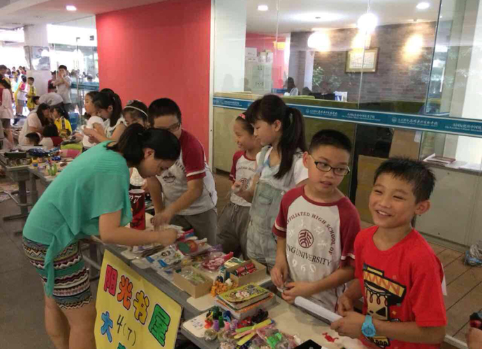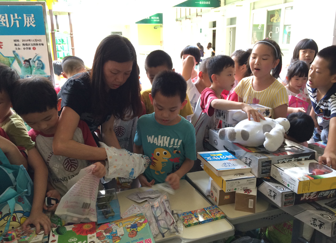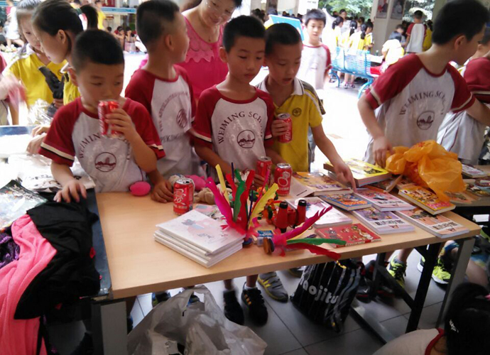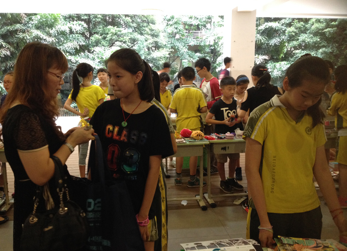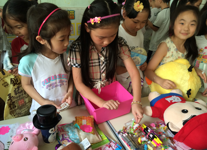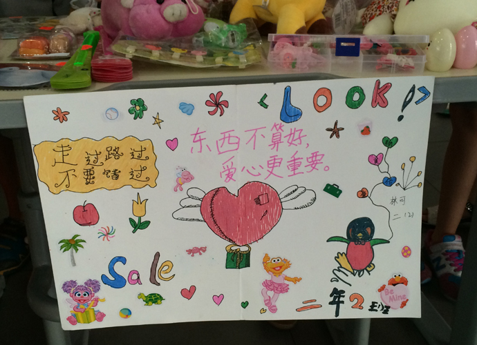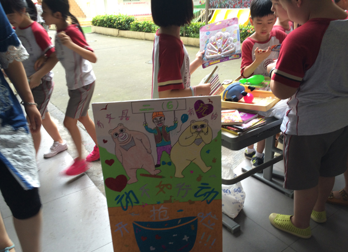 二年级的孩子们积极主动参与,从早早地帮老师摆桌子,确定自己班的摊位区域,再到整个义卖活动的用心参与,孩子们都热情高涨。利用周末,孩子们各自准备了自己的“义卖品”,家里的小玩具、图书、小公仔等,都成了孩子们手中义卖的“筹码”。他们给自己的商品标上了价钱,而且还制作了各式精美的海报:“欢迎来到天使小铺”、“六一跳蚤市场,付出爱心,收获快乐”、“东西不算好,爱心更重要”、“心动不如行动”等,这些时尚的创意语让我们不禁感叹:虽然孩子们的年龄小,但他们的创意思维不可小觑。有的孩子负责在班级摊位前推销商品,有的孩子负责“收银”,有的孩子负责介绍示范商品,一个个忙得不可开交。当有老师和同学上前询问商品价钱并与其讨价还价时,这些天真的孩子们表现出了“商家”的风范:“行,就这个价钱给你吧!”当“顾客”买得较多时,还会附上一句:“这个送给你吧,买三送一,很划算哦”。还有的孩子将自己平时画的作品也带来义卖,她们见到老师过来立即宣传自己的作品:“老师,这是我自己画的,五元一张,你买一张吧!”看着孩子充满童真与期盼的眼神,老师也“慷慨解囊”,不为别的,就为孩子的作品点个赞,为孩子的自信点个赞!为孩子的爱心点个赞!