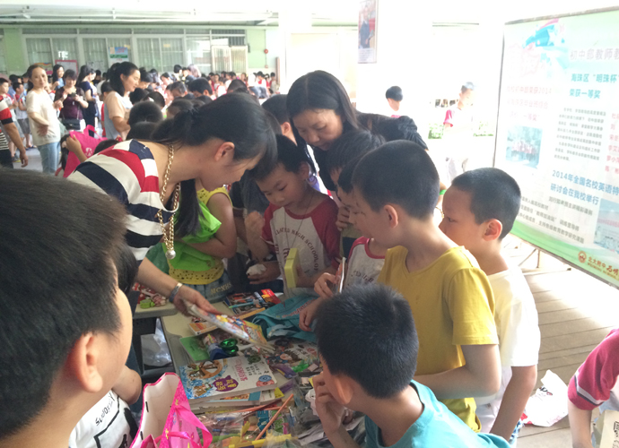 6月2日下午,校园里人流涌动,热闹非凡,叫卖声不绝于耳,俨然一副小商品市场的阵势,原来是小学部一年一度的“六一跳蚤市场”又开市了。