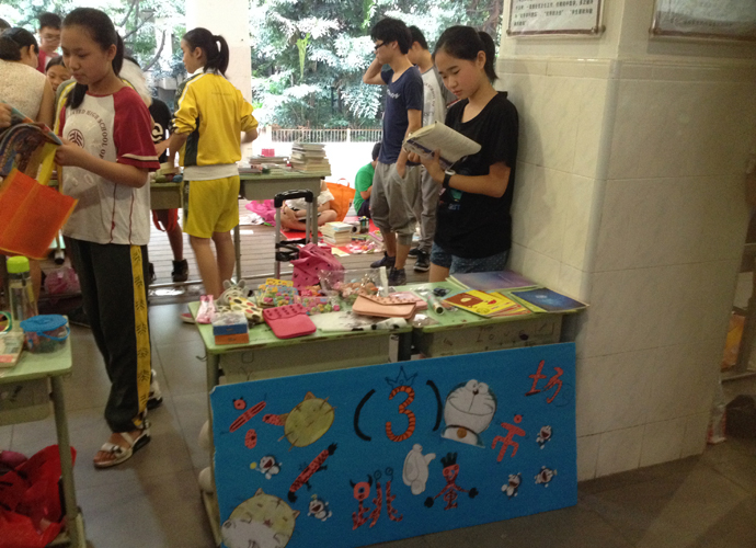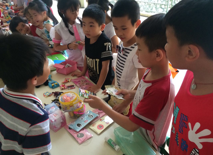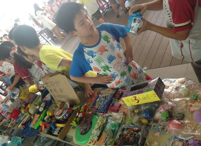 走过四年级的跳蚤市场买卖区域,各种各样的毛绒玩具、书、文具、饰品、生活用品等等“商品”摆满了一个个小摊,每个小摊都有个温馨的名称——“爱心小超市”、“星星精品屋”、“精灵小书摊”……每个摊位三五人一组,孩子们轮流担任“经理”,还设立了物品整理员、保洁员、收银员等职位。他们将每件物品明码标价,进行自由买卖。摊位前的广告牌也很有创意:“卖出商品,献上爱心”、“购物够深情表祝福”、“你的选择,我的追求”等。还有的孩子当起了“流动摊贩”,拿上自己最得意的商品,选择好对象进行“推销”,一个个兴高采烈,似乎成 效不错。