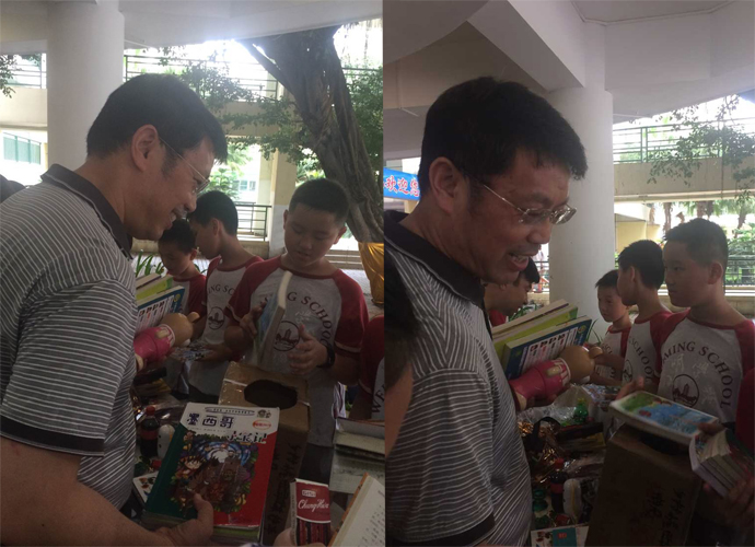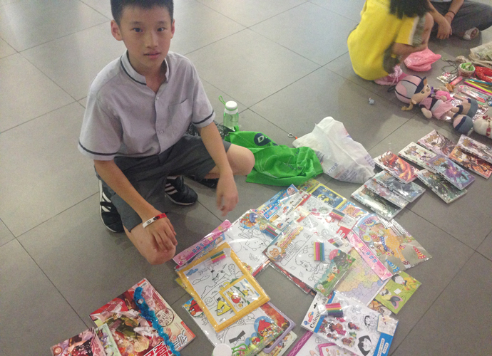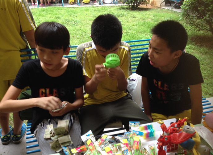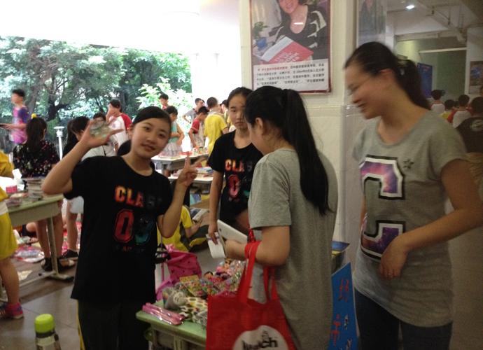 五年级的今年的跳蚤市场位于招生办前厅外围,孩子们的摊位摆放整齐,生意却比往年清淡。可是孩子们的热情不减,捐赠爱心不减,为大家服务的奉献精神不减。五年级孩子的出售物品定位适合孩子,甚至吸引了王校长在这里寻到了很多心仪的儿童读物。爱心捐赠好几个班都分别高达七百多,甚至九百多元。五年级的11位同学牺牲短暂而难得的跳蚤市场活动时间,主动承担包饺子任务,冒着酷暑,在生活部的“市场“为大家提供新鲜美味的水饺。