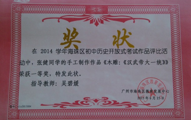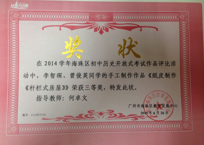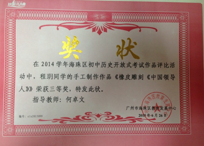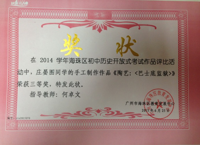 本学期,初中历史备课组组织学生参加了2014-2015学年度海珠区初中历史开放性考试作品评比活动,并推荐9件学生作品参加了本次评选,其中5件作品分别获得了一等奖、三等奖的好成绩。