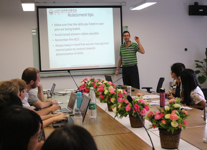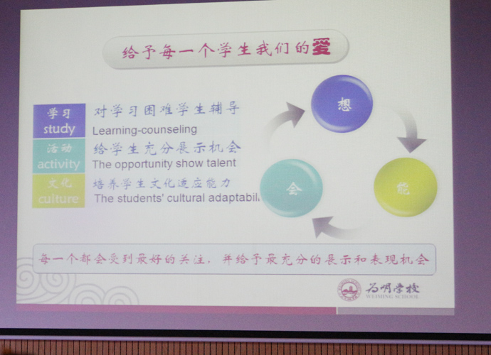 29号上午,秦校就学生培养问题做了题为《办国际化的优秀中国学校 ,让学生成为学校的核心竞争力》培训。我们的目标是培养学生六种能力,双语言表达力 、双文化理解力 、跨文化世界观 、成功心理素质 、卓越的表现力 、未来领导力,以满足三高(高知、高位、高资)家庭子女成为未来社会精英的需要。
