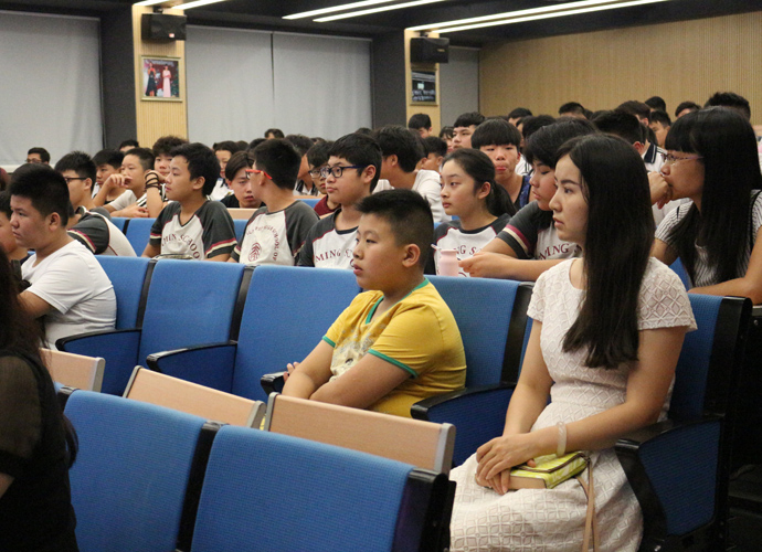 9月2号下午,语言测试结束后,秦新春校长在学术报告厅给同学们上开学第一堂大课——《新的起航 心的期待》。秦校承诺,给予每一个学生我们的爱 ,每一个学生都会受到最好的关注,并给予最充分的展示和表现机会。我们的培养思路是:为明的国际化并不是把中国人变成美国人,而是教育学生做一个有中国身份的世界公民。让我们的学生认识自己、喜欢自己,同时也真正了解、欣赏他国文化,而不沦为对他者文化的盲目模仿、崇拜者,这才是真正的国际化与世界观。希望同学们从开学的第一天起,就思考自己的目标,做人生规划。一旦同学们明确了目标之后,应该怎样去做。秦校引导同学们思考三个问题:美国大学如何申请?美国大学对人才有何要求?为明学校国际课程怎样准备?并一一解答。