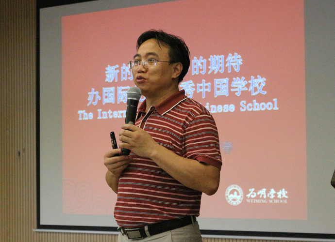 8月27号在三楼会议室,秦新春校长给全校教职员工作了题为《办国际化的中国学校The Internationalized Chinese School 》的讲话,主要包括两大方:1、怎么理解学校的办学定位(How to understand the school positioning)——国际化的中国学校(The Internationalized Chinese School) 2、怎么实现学校的办学定位(How to carry out the school positioning)——六个国际化的标准(Six internationalized standards)。