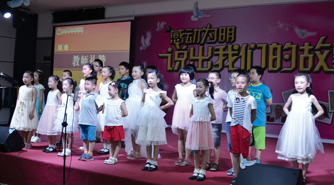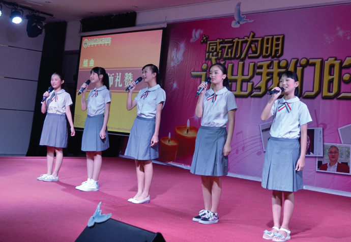 活动在组曲《教师礼赞》的歌声中拉开帷幕。除了小学部声乐团的尖子选手献歌外,现场将近20名特殊“小歌唱家”的演唱让老师们热泪盈眶,那是教师子女代表带来的《老师》。他们的歌声和表演尽管不是最专业的但绝对够真诚、够纯真。在他们的歌声中透露出一种别样的味道,让感恩的成分变成双份,让献礼的敬意加倍。