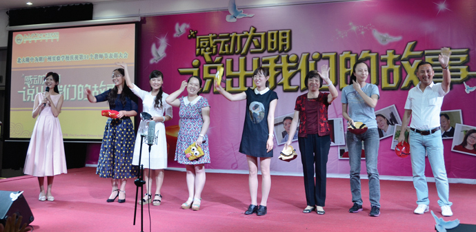 在这十几年的北大生活中,感人的故事、特别的故事、难忘的故事太多太多。本次大会分别邀请了教师代表高中部黄玉娟老师、小学部家长代表、初中部学生代表、嘉宾代表唐春霞老师、职员代表敬秀颖老师纷纷上台演讲,和大家一起分享他们的为明岁月。