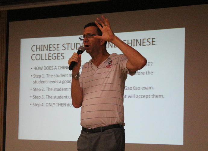 Trevor首先展示CHINESE STUDENTS AND CHINESE COLLEGES中国学生和大学:HOW DOES A CHINESE STUDENT GET INTO A GOOD COLLEGE?中国学生怎么进入好大学?Step 1. The student must get into a good school. Therefore the student needs a good grade on their ZhongKao.Step 2. The student must get a good score in the GaoKao exam.Step 3. The student usually looks for a college that will accept them.Step 4. ONLY THEN do they choose their course.