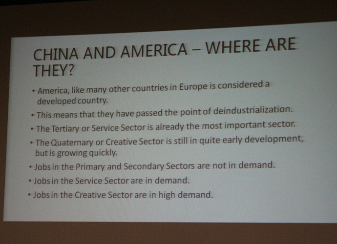 CHINA AND AMERICA – WHERE ARE THEY?中国和美国—他们处于什么位置?CHINA – A DEVELOPING COUNTRY。CHINA – ECONOMY STILL BASED ON INDUSTRY中国是发展中国家,依然以工业为基础。The Chinese Economy has not yet passed the point of Deindustrialization.Even so, the only sector that is really developing and will continue to develop years into the future is the Service Sector.The Creative Sector will probably only start developing in around 10 years’ time.At the moment there is a high demand for jobs in the Manufacturing and Selling Sector, as well as demand in the Service Sector.In 5 or 10 years time, the demand for jobs in the Manufacturing and Selling sector will start to drop, while the demand for jobs in the Service Sector will continue to grow.