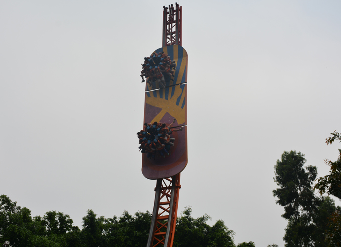 迈入大门,首先映入眼帘的是大型的复合式工艺花坛,上面高低错落、五彩缤纷的鲜花不禁使人眼前一亮;而左右两排高高柱子上分别伫立着不同造型、惟妙惟肖的白虎雕像,游园的气息扑面而来。没走过多远,一浪接一浪的尖叫声直钻耳膜,让同学们心生好奇,一下子被吸引过去了。原来是呈现在面前的是传说中宏伟的十环过山车!十环过山车惊险刺激,游园内同类型的游戏项目还有U型滑板、垂直过山车等。它们的共同特点是将过山车运行到几十米的高空中,稍作停顿后,以不同的坡度从高处往下俯冲下来,会给人以挣脱地球引力的感觉,令人体验失重的奇妙感觉,同时也会感到惊讶无比,恐慌不已。一些勇敢的同学按捺不住,率先拔腿跑去排队,用行动来证明自己,不断挑战自我,感受刺激。