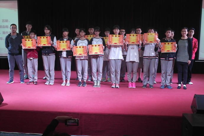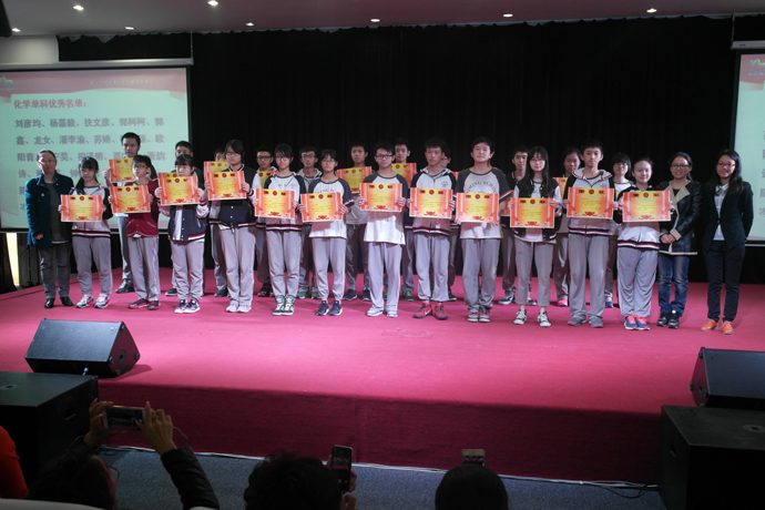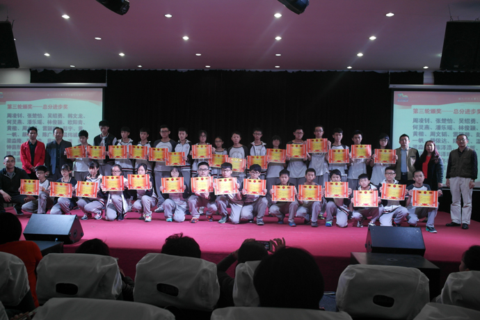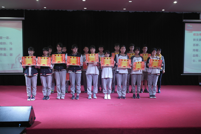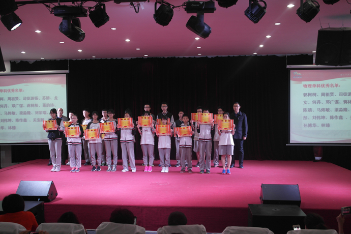 表彰一共有六轮:单科优秀、体育满分、总分进步、总分突出、总分优秀、数学题竞赛,获奖的同学有秩序的上台接受学科老师、班主任、学部领导的颁奖。