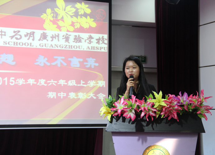 会上,贺光艳级长以“小初衔接,我们准备好了!”为主题讲话。贺级长首先对年教教师团队及各班基本情况作介绍。以孩子们升上六年级后的三大困惑引入开学至今,我级着重从“常规管理—抓习惯养成 ”、“创新课堂—提高效率”、“学生评价—力求全面 ”“活动自主—重在育人 ”四大方面展开的工作及取得的成效。