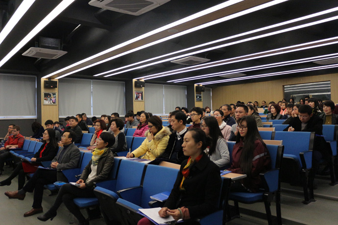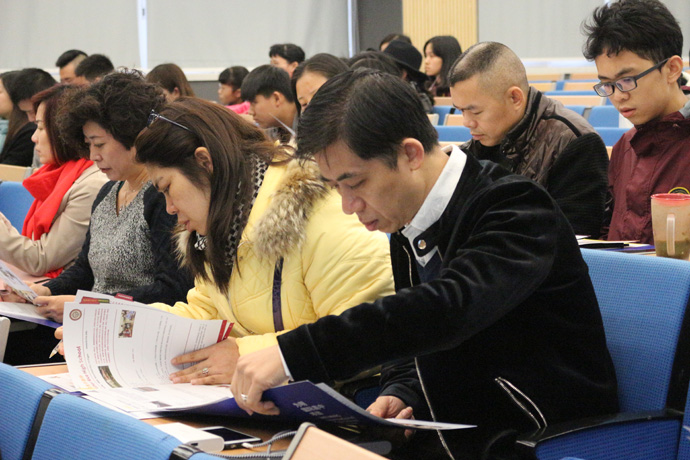 下午二点五十分,宣讲会即将开始前,会议厅里已是座无虚席,家长和孩子们认真地观看大屏幕播放的学校宣传视频。