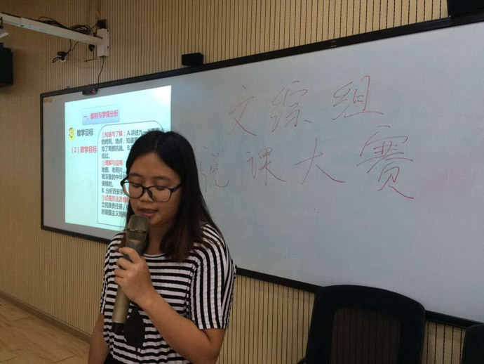 吴碧媛老师展示了《难忘九一八》,何卓文老师展示了《秦王扫六合》。两位老师虽然年轾,但对历史材料教学作了很细致很娴熟的实践。本次主题活动亮点在于:自主学习法和材料教学法两相结合。例如:学生通过自主阅读教材,以教材为材料获取基础知识,在教学方式上实现了从“教教材”到“用教材”的转变。何老师的说课过程目标表述准确,教法灵活,有学生喜欢的图片资料和音频工具,预估教学高效。何老师说课语言简练清晰、动作大方自然,时间得当,过程完整。吴碧媛老师说课过程亮点频频:爱国教育主题鲜明,目标达成度高;课件制作精美无瑕,过程清晰;教师个人专业素养高,善于把握教材等。