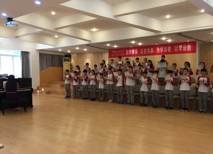 首届为明杯课堂教学大赛,音乐教研组初步研究出范式教学:感受—实践—展示,暨复习导入&基训导入–聆听感受&欣赏感受–体验实践–展示评价。本学期,教研组所有老师均按照这个范式进行教学设计。进一步研讨范式教学的可操作性,呈现出良好的教学效果。