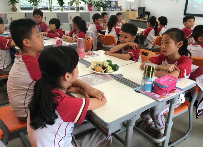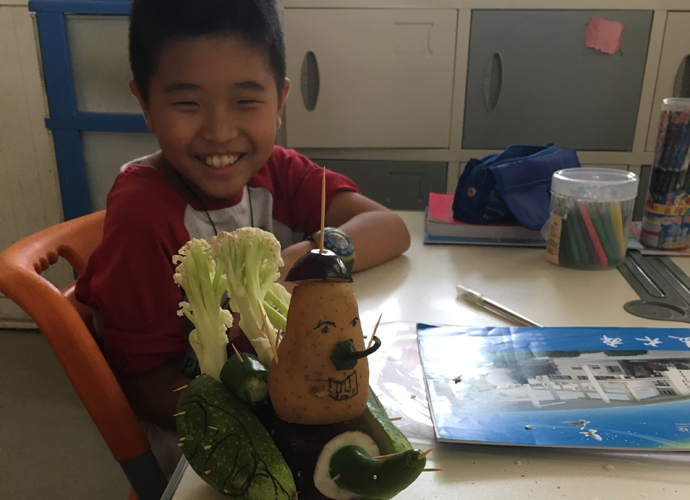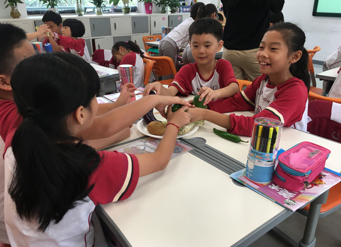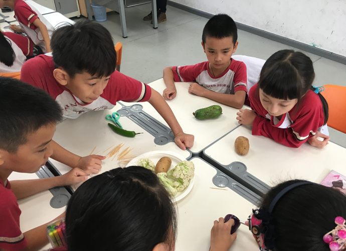 课堂是学生发现自我,表现自我,发展自我的舞台。在整个课堂教学的过程中,教师要充分体现学生的主体性,让学生参与到活动中去,把课堂还给学生,把乐趣还给学生,把权利还给学生,在轻松愉悦的教学环境中,在尊重学生自主地位的基础上,营造一个和谐、民主的环境,这样才能真正实现课堂学习的民主,美术教学也是如此。在王峰老师执教的《蔬果造型》这一课时,自己从市场采购大量的新鲜蔬果,以小组为单位,进行小组创作,学生在老师示范的原有基础之上再创作,有的做成了蔬果小人,有的做成了蔬果汽车,有的做成了蔬果怪老头等等,在整个教学过程中,老师都激励学生参与到小组合作中,每个孩子都是学习的主人,既全体,又个体,在分工合作中体验成功的感觉。当一幅幅作品立于展览区的时候,看到集体合作的成果,孩子们笑得合不拢嘴。