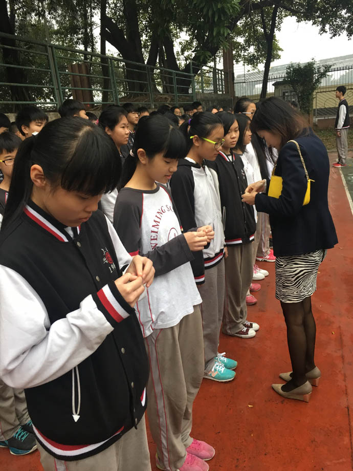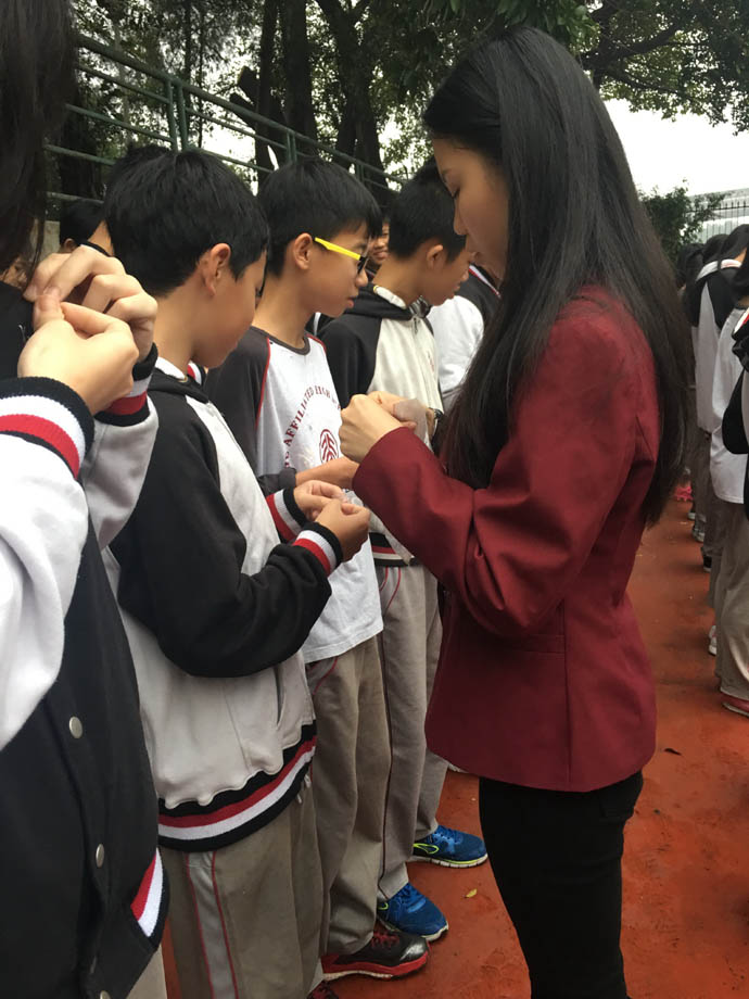 仪式第二项,由年级组长陈国斌老师、杜小薇老师、何卓文老师为新团员佩带上了象征着共青团员肩负重任的团徽。