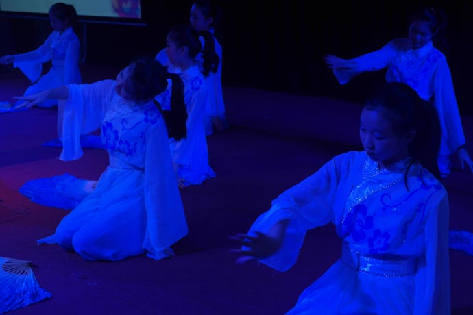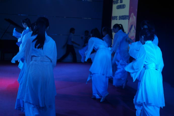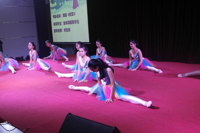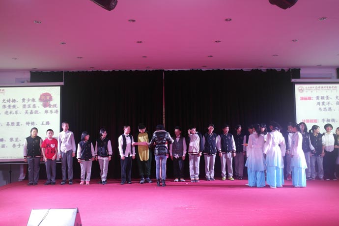 第三个环节是舞蹈队带来的舞蹈《蜕变》、《床前明月光》、声乐班男女生合唱《明日歌》、《库斯科邮车》。这几个节目在李日娣、王斌、何珊珊三位老师的指导下在广州市都获得了大奖。瞧,初中的精灵们上场了,她们用长眉、妙目、腰肢、手指,轻云般的慢移,旋风般的旋转,雷鸣般的跳动。她们舞蹈出一个优美的故事,时而双眉颦蹙,时而笑颊灿烂,时而婉转的娇羞,时而无边的喜悦。随着跳动的旋律,她们舞动出了离合悲欢,唱出了美妙的歌声,场下的观众无不微笑默叹,雷鸣般掌声阵阵响起。