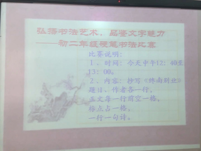 为进一步传承和发扬中国书法文化,激发学生对祖国灿烂文化和语言文字的热爱之情,展示学生硬笔书法风采,增强学生写规范字、用规范字的意识,传承传统文化,营造校园文化建设氛围,初二年级于3月4日举行了硬笔书法比赛活动,全体学生参加了比赛,学生们都满怀激情,用心书写每一个笔画、每一个汉字。在短短的二十分钟时间内现场完成。