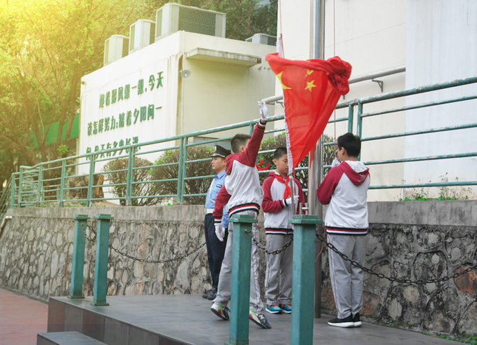 创意秀后,尤良穗、黄泰霖两位小主持来到国旗台下,“出旗”一声令下,全体师生行注目礼,英姿飒爽的国旗护卫队队员们护送鲜艳的五星红旗进场,行礼完毕,伴随着庄严的国歌,全体师生凝视着迎风飘扬的五星红旗,高唱国歌,心中升腾起对祖国无比的热爱。 随后,在大队委刘恬恬同学的指挥下,全体齐唱校歌。“敢为先,常为新……”校歌唱出了我校学生昂扬向上的精神风貌和我们厚德明理求知进取的校训。