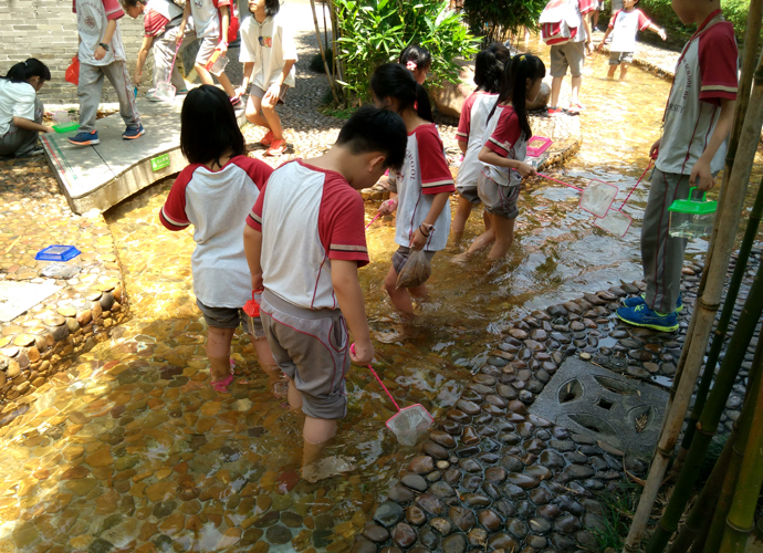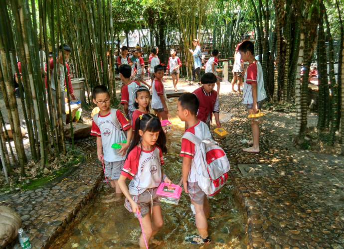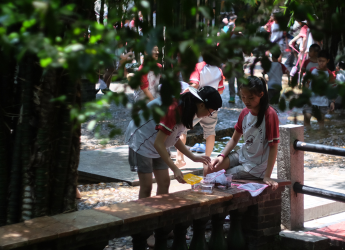 午饭过后,真人版的“捕鱼游戏”在园区欢乐上演!捕鱼游戏还未开始,孩子们早已等候在“紫竹园”的小溪旁,小渔网和盒子也早已是恭候多时。当小鱼儿从源头被放出来,紫竹园瞬间欢腾起来,孩子们起初只是在台阶上用渔网捞鱼,玩到兴奋时,孩子们脱掉鞋子和袜子,卷起小裤腿后直接就“扑通”跳下水,惹得旁边的同学们阵阵欢笑,激动不已。快乐的时光总是短暂的,孩子们带着春游的“收获”,恋恋不舍地返回了校园。