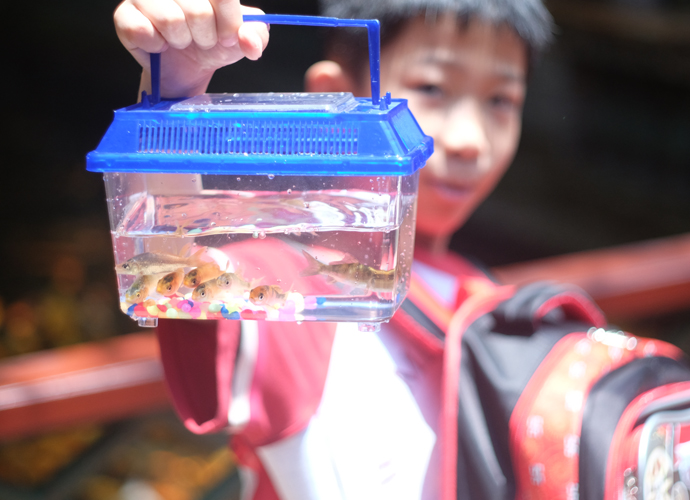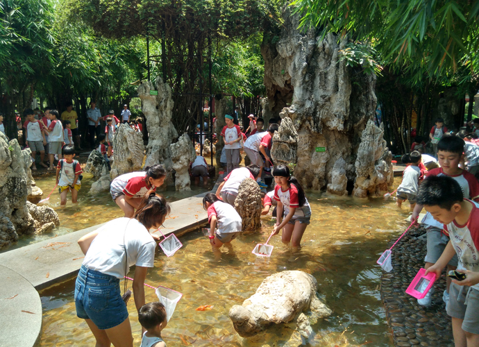 然而,最让孩子们开心的莫过于喂鱼和捞鱼了。每当孩子们将鱼食撒入池塘,鱼儿们争相抢食。喂食过程当中,孩子们在潜意识里甚至出现了喂食大赛,看谁吸引的鱼儿多!每当大把大把的鱼食撒入池中,鱼儿们抢得不亦乐乎,互相拍打着尾巴,不时还将池中的水拍到了孩子们的脸上,似乎就是鱼儿在和孩子们嬉戏玩耍!