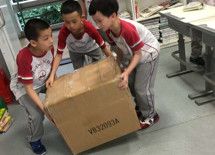 经过一周的筹备,装有将近600套图书的5个大箱子被打包,一同寄出的还有一箱乐高玩具以及一定数量的文具用品。这满满5箱赠品,载着孩子们的祝福,载着家长们的关心,也载着北大附中为明广州实验学校老师的情谊!