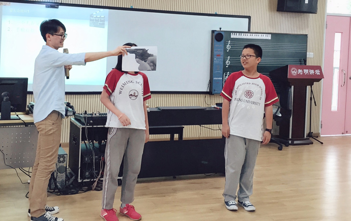 在说到电影特点的时候,刘老师通过几个简短的视频,结合典型案例的讲解,让同学们现场感受,深刻理解了电影的逼真性、假定性以及运动性这几个最重要的特点。通过电影特点的介绍,引出了爱森斯坦的“蒙太奇”理论。刘老师给大家展示了最典型的蒙太奇试验“库里肖夫效应”,同时请现场学生表演配合,让同学们对电影的“蒙太奇”手法有了一个基本的认识。