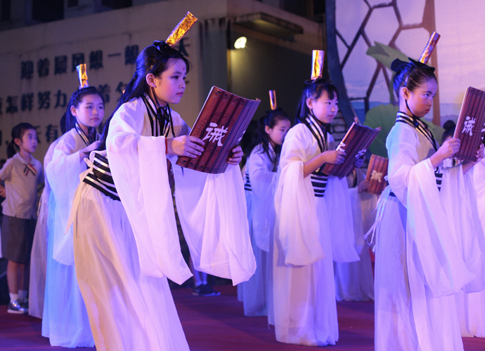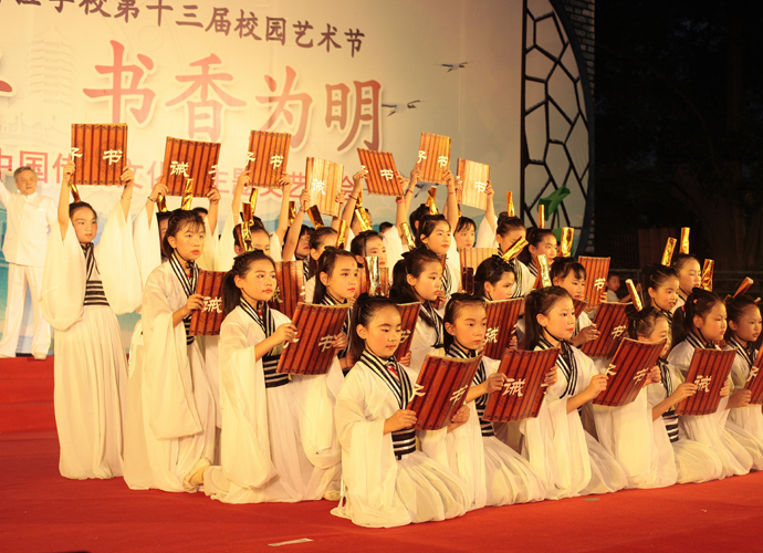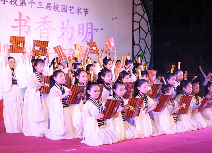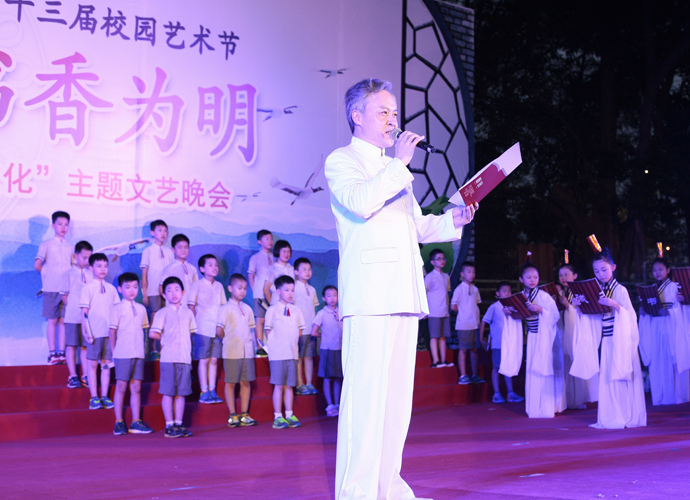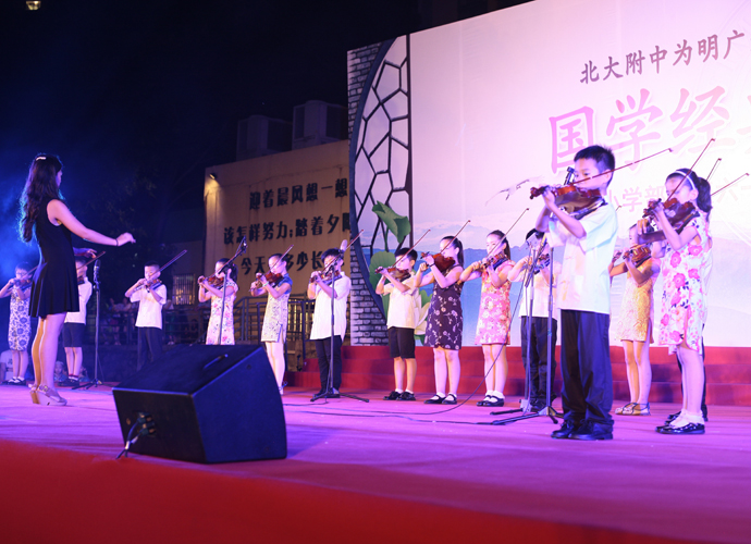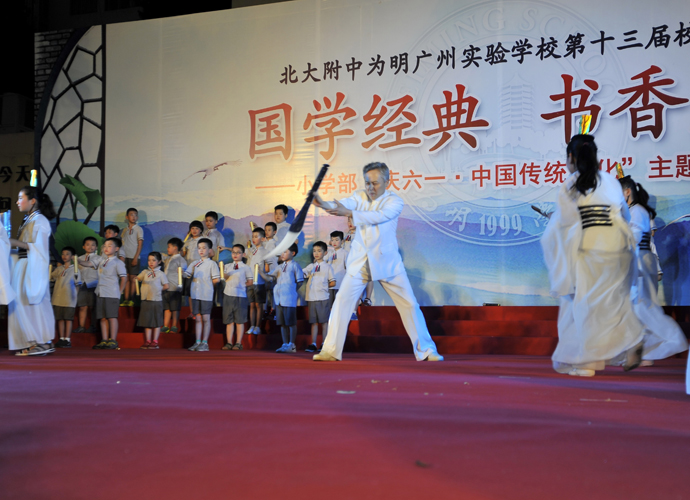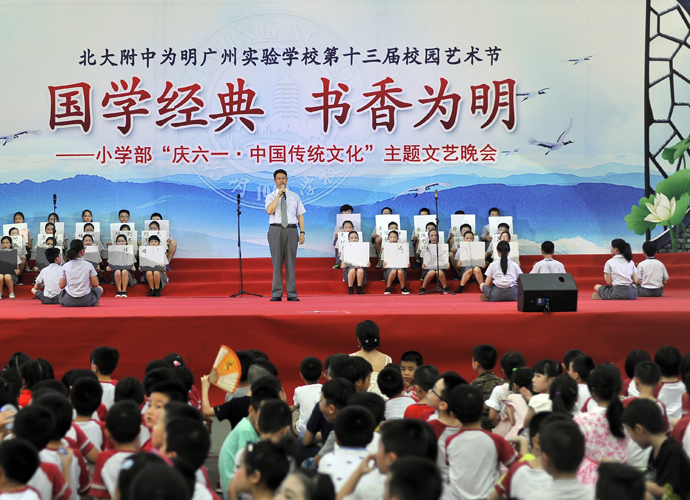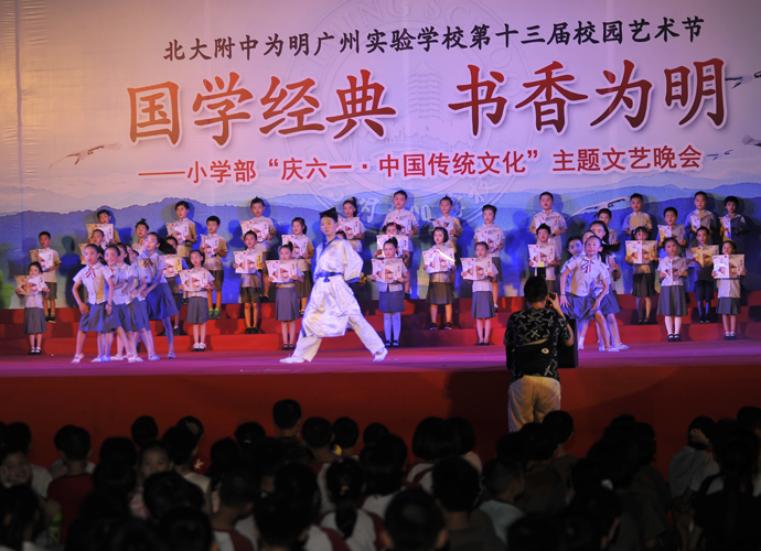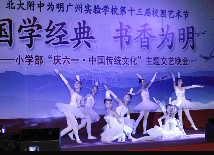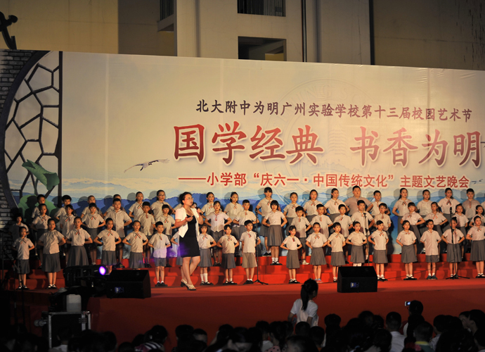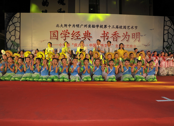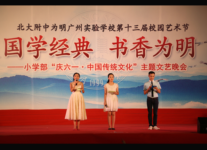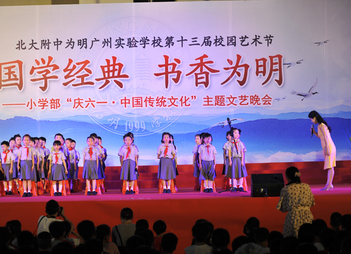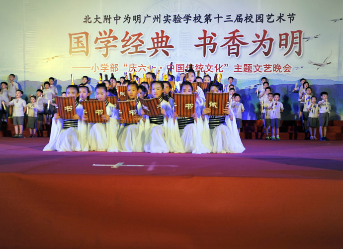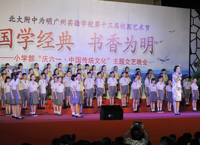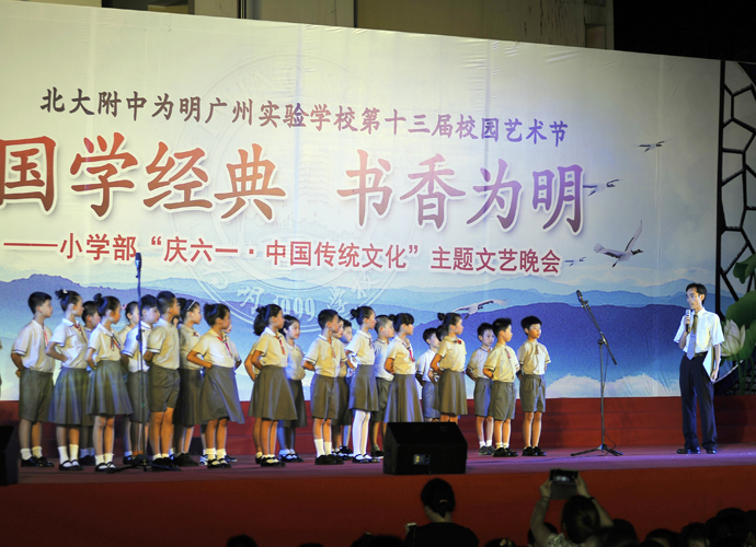 2016年 6月1日晚,“国学经典 书香为明”庆六一大型主题文艺晚会在北大附中为明广州实验学校精彩上演。晚会以“国学新课堂”的创意,采用情景诵读、歌舞、合唱、粤语吟诵、器乐演奏等艺术形式多角度演绎了中华经典国学,让师生们及来宾们品味着一场中华民族传统文化的精神盛宴。