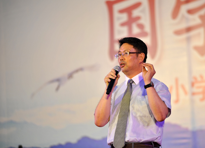 序篇《亲近经典》,王礼维校长以“为明讲坛”正式开讲,同学们用诸葛亮的《诫子书》拉开了晚会的序幕。紧接着,歌舞表演《我学弟子规》、《千字文》等欢乐上演。小书生们身着汉服,手拿书卷,在舞台上表演。书声琅琅,阵阵吟唱。期间,还有国家一级演员——“灰太狼”的配音者张琳老师挥毫助阵。晚会中,“蒙学篇”、“亲情篇”、“田园篇”、“励志篇”四个篇章分别由校领导和骨干教师担任主讲,引领着孩子们感受国学经典的魅力。