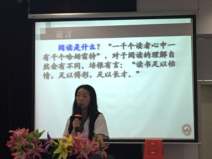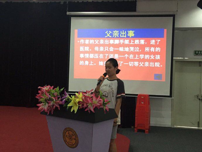 阅读分享会由语文组长陈少君老师亲自主持。陈老师开宗明义地指出分享会的目的和意义:我们初一同学要以满腔的热诚,纯净的心灵去汲取经典书籍中的点点滴滴值得我们学习的精华。