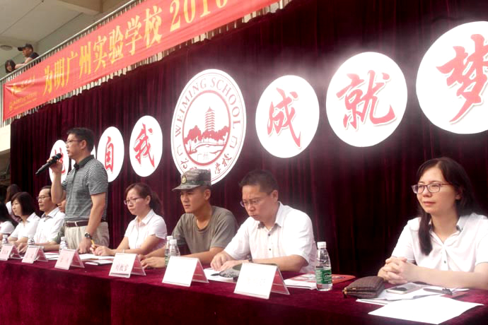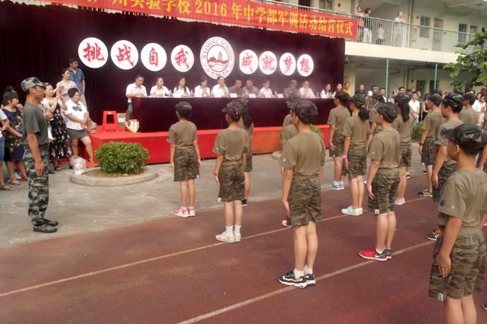 8月26日,经过五天的艰苦训练,北大附中为明广州实验学校2016级初高中新生军训圆满结束。晨光初绽,七点,所有参训的师生和教官齐聚学校运动场举行隆重的闭营仪式。北大附中为明广州实验学校王礼维校长、广州民兵预备役训练基地刘教官、校长办公室王崴主任、人事部易湘科主任、招生办金俐主任,总务喻国胜主任,财务部刘金华主任、高一级部主任樊景玉、初一级部主任唐根旺、元培级部主任刘飞,以及各班的班主任、教官和家长朋友们参加了此次闭营仪式。