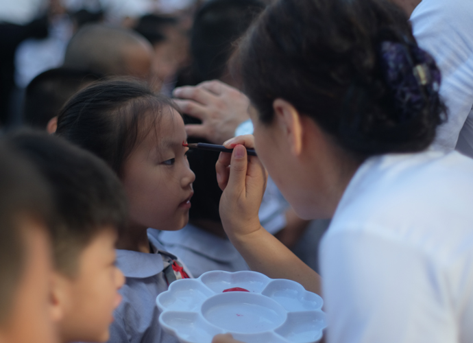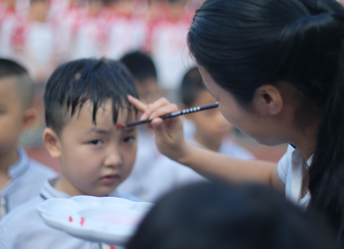 “开笔礼”是中国古代读书人成长过程中的首次大礼,“开笔”也称“启蒙”,意即儿童进入学习阶段,是对学前儿童进行的一次尊师崇礼的启蒙式教育。在仪式上,“萌娃”们在老师的帮助下,端正衣冠,出色完成仪式第一步;领导和老师们一起用鲜红的朱砂在孩子们的额头正中点痣,为他们开“天眼”,共同期许孩子们身心健康、聪慧地茁壮成长;“击鼓明智”环节,李彪老师上台敲击大鼓三声以示孩子从今启蒙。“贤师启智”的过程中,李亚书老师带领着孩子们启蒙描红,孩子们在班主任的帮助下漂亮地描出了“人”字,希望孩子们今后都能学会做人。最后,在小主持人的引领下,孩子们向老师们三鞠躬表达敬意,并齐齐宣誓:尊敬老师,友爱同学,遵守纪律,有志于学,珍惜时光,发奋图强,坚持锻炼,身体强壮,入学为明,快乐成长。孩子们声音嘹亮,意志坚定!