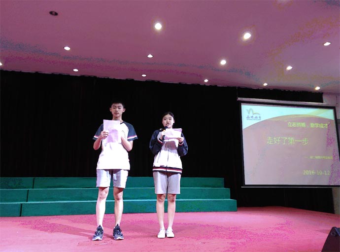 上午9:40,初三级部的学子已经端坐在报告厅,大会由学生陈峰霆、李诗曼两人主持。。