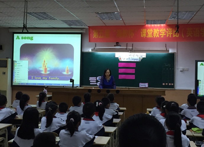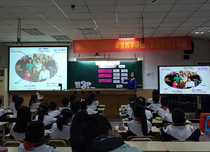 在赛场上,赵彦老师语言简明,风趣幽默,教态自然,临场应变能力强。本着整合教材、帮助学生内化能力的思想,采用任务型教学,结合情景教学和游戏教学的模式,以激发学生兴趣为前提,以 “family”为主线,设计各个不同的家庭场景。整堂课从学生基础出发,通过有效情景和活动的设计,让学生多说,多思考,让他们始终处于思维活跃中而不是直接简单的问题交给学生;从促进学生学习的角度来设计教学,做到以学定教,为学生的学而教,达到难度较大的内容能够“深入浅出”。本着层层递进,环环相扣,由浅入深的原则,不仅信息量大而且口语拓展给了学生更多知识熟练运用的操练空间。
