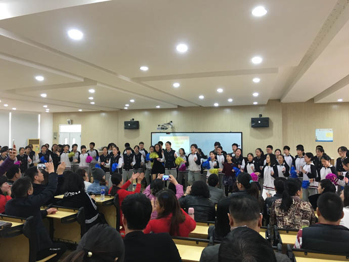 2016年12月2日早上,元培级部七年级师生、家长齐聚B315教室,举行了一次别开生面的家长会暨期中表彰大会。大会在学校领导、级部刘飞主任的指导下,由莫俊峰级长策划组织,梁晓娟老师、刘行知老师精心准备,幕后安排;以期中考成绩分析和颁奖为主要内容,其中穿插有学生自编自演的话剧小品,老师指导编排的大合唱和集体朗诵,优秀学生感言等,内容丰富充实,亮点频频。会场气氛热烈,掌声不断。