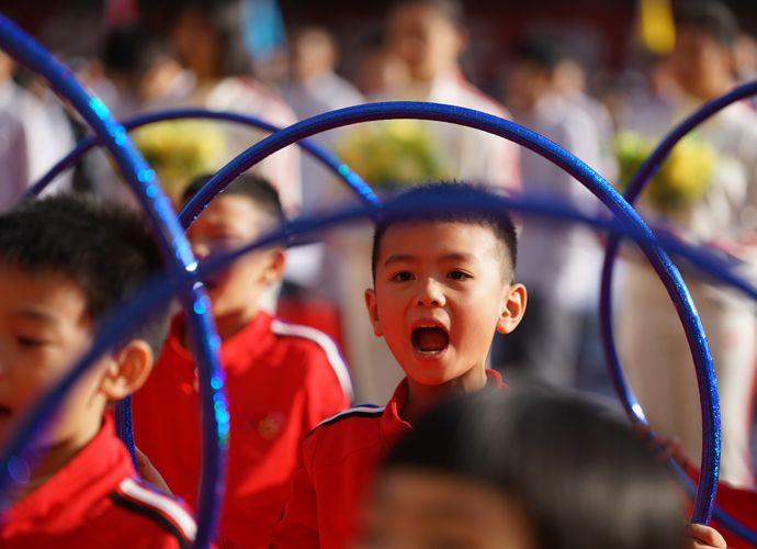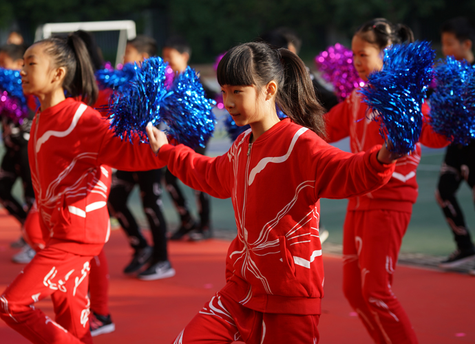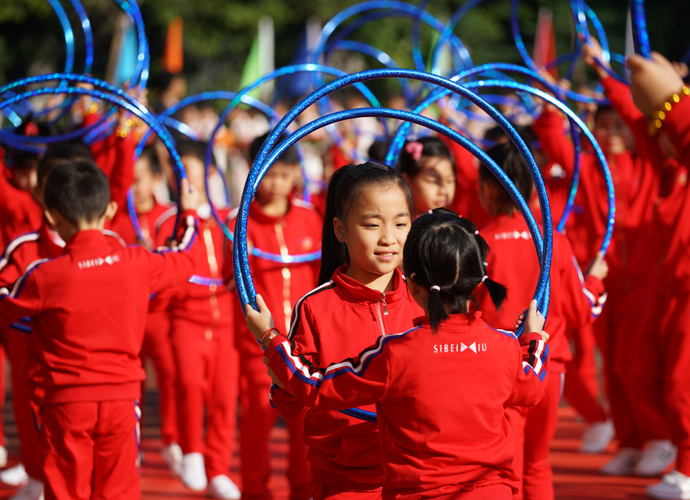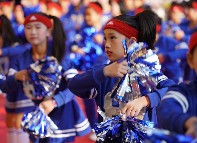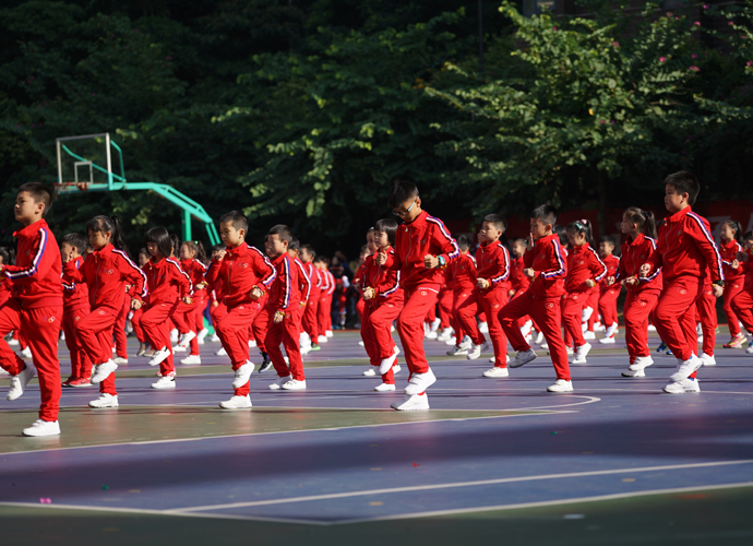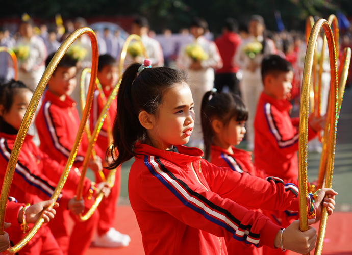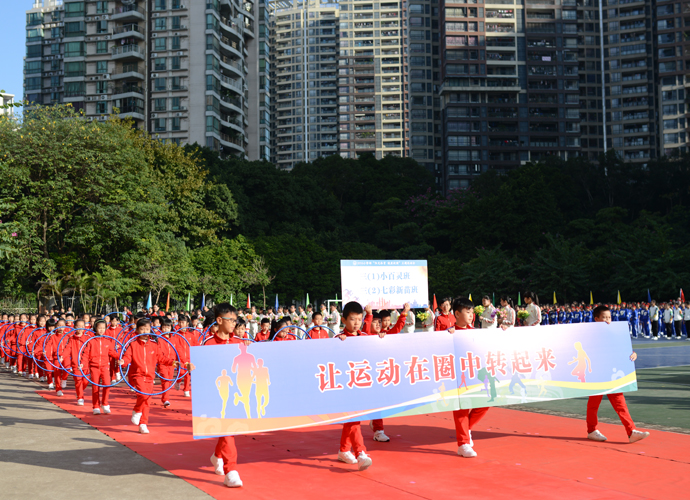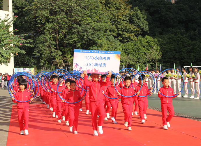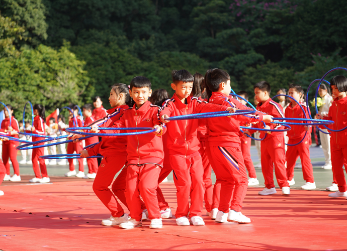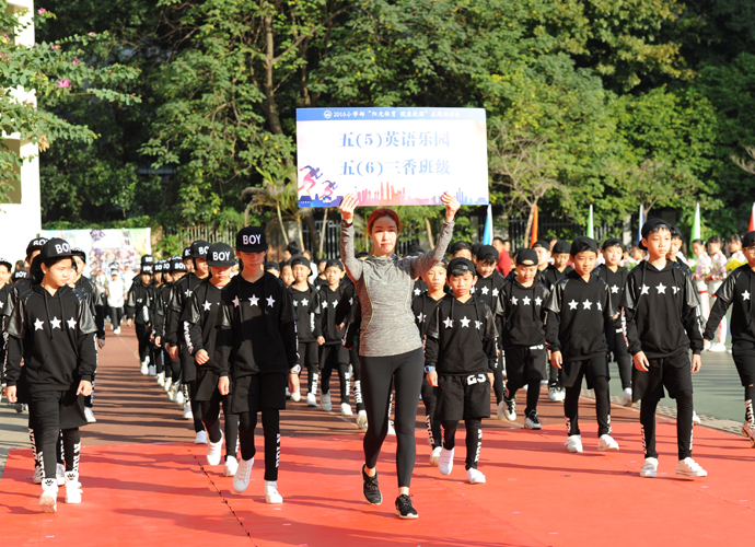 五年级“激情韵律操”方阵作为首个展示的大方阵,动感的啦啦操、帅酷的爵士舞和高雅的网球操表演,带动了全场观众的热情。四年级267名学生组成的“花样跳绳”方阵玩出了新花样,有单人跳、双人跳、多人跳、小组跳等,真是花样繁多! 三年级“趣味呼啦圈”方阵,孩子们将舞蹈的优美和体操的韵律完美结合,腰间的呼啦圈也随着节拍在翩翩起舞。伴着美妙的音乐,二年级同学带着“花式皮筋”出现在了观众眼前,小小的皮筋在跳跃中蔓延成五线彩谱,孩子们活泼的身影交织成了一阙阙美妙的词曲;厚重的传统文化,也在孩子们轻巧优美的现代游戏中得到了良好的传承。“动感篮球,快乐我秀!”这是一年级小萌娃们的运动宣言。他们头戴发箍、身着红色篮球服,手捧着篮球表演,甚是可爱!他们的爸爸妈妈也统一着装,自发组织了鼓号仪仗队,在萌娃的队列前后呐喊、助威。最后一支神秘的队伍是班主任方阵,当孩子们看到自己的老师走向主席台,内心激动不已,不断地欢呼雀跃,为老师们鼓掌。