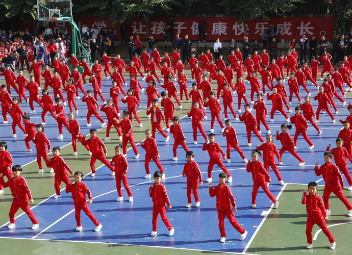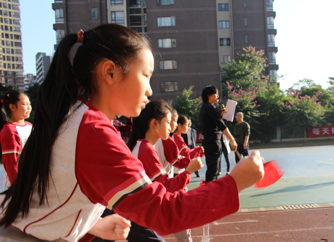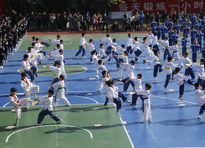最震撼:跆拳道运动员静若处子动若脱兔。优质时尚的四、五年级跆拳道表演,动作整齐划一,喊声震撼全场。《健康搏击跆拳道》表演由体育组糜清秀和李思老师精心编排,不仅融入了跆拳道中常见的拳法和腿法,还进行了飞踢木板等专业表演,集专业和实用于一身。跆拳道课,教会学生‘以礼始,以礼终’的尚武精神,并培养顽强、果断、耐劳的精神,磨炼学生坚韧不拔、积极向上的品质,养成礼让谦逊、宽厚待人的美德。