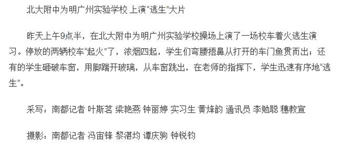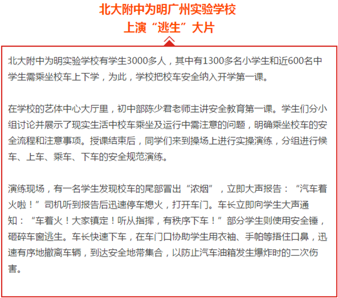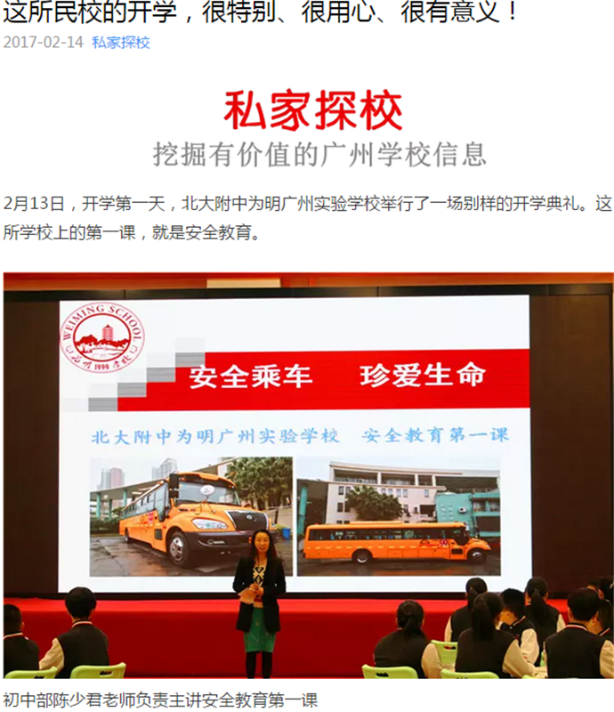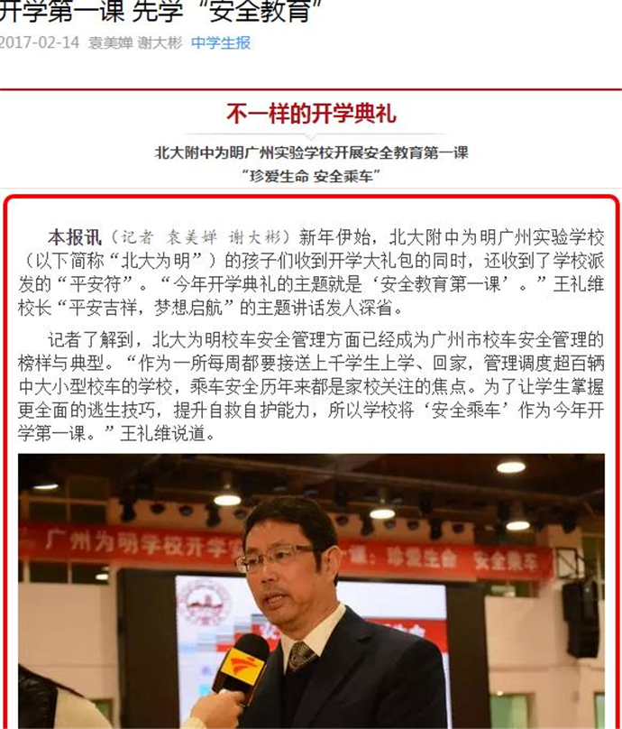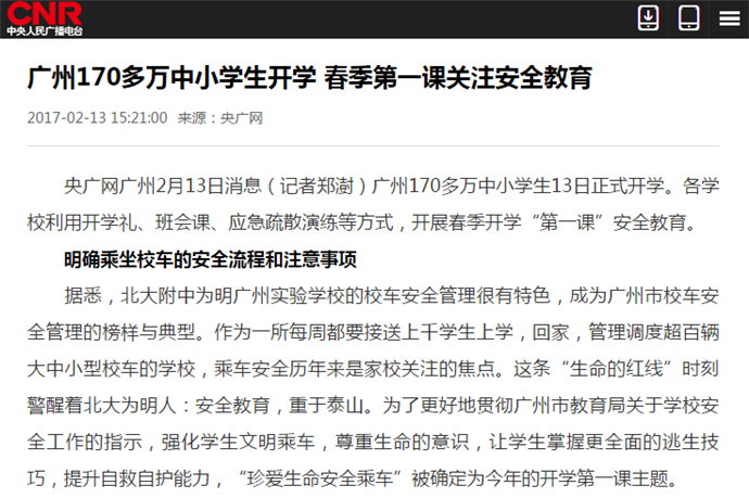 随后,我校“安全教育第一课”的新闻出现在各大报刊,电视台等媒体报道中。主要有:中央人民广播电台、广州日报、南方日报、信息时报、新快报、新华网、南方网、南方都市报、广州青年报、中学生报、现代中小学生报、广东电视台现代教育频道,花城频道、求学指南、私家探校等,媒体纷纷为我校的开年第一课点赞,引起了社会各界的热烈反响!以下是部分媒体的相关报道截图和链接: