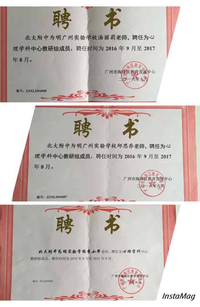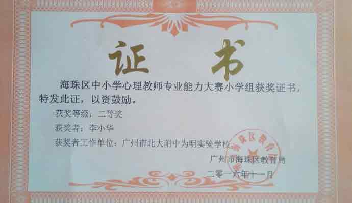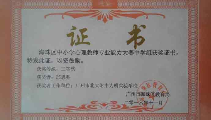 16-17学年度,我校汤丽莉、邱思乔、李小华三位心理教师都被吸纳为“海珠区心理学科中心教研组成员”,并主动承担区级公开课、参加心理教师高级研修班、报读心理专业技能培训课程等渠道不断提升专业综合能力,更高效地服务于学生的心理健康教育工程。两位教师代表我校参加首届“海珠区中小学心理教师专业能力大赛”均获佳绩。李小华老师和邱思乔老师分别荣获小学组二等奖和中学组二等奖,为顺利迎接心理特色学校的市级评估再添“筹码”。